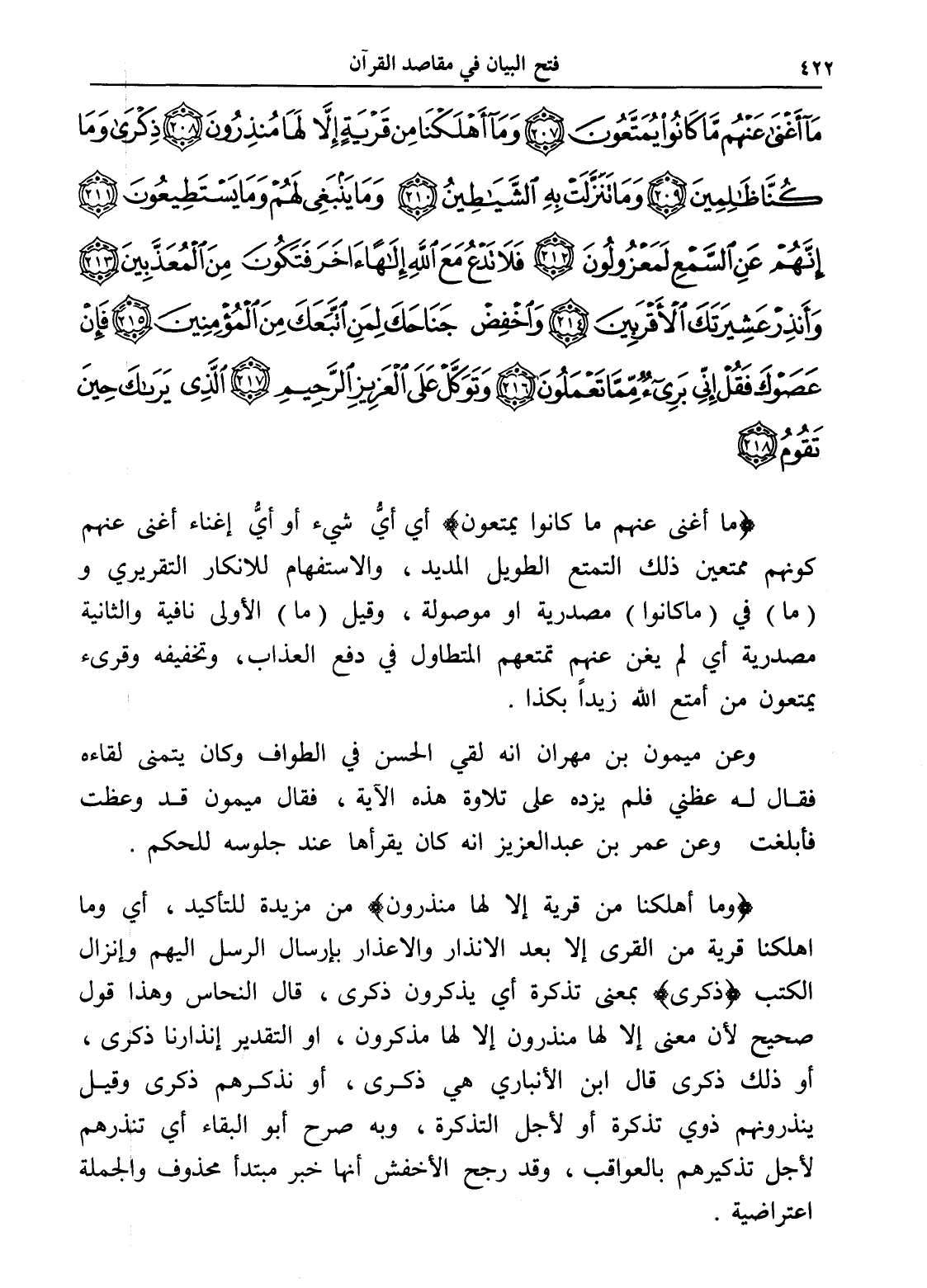 مَا أَغْنَى عَنْهُمْ مَا كَانُوا يُمَتَّعُونَ (207) وَمَا أَهْلَكْنَا مِنْ قَرْيَةٍ إِلَّا لَهَا مُنْذِرُونَ (208) ذِكْرَى وَمَا كُنَّا ظَالِمِينَ (209) وَمَا تَنَزَّلَتْ بِهِ الشَّيَاطِينُ (210) وَمَا يَنْبَغِي لَهُمْ وَمَا يَسْتَطِيعُونَ (211) إِنَّهُمْ عَنِ السَّمْعِ لَمَعْزُولُونَ (212) فَلَا تَدْعُ مَعَ اللَّهِ إِلَهًا آخَرَ فَتَكُونَ مِنَ الْمُعَذَّبِينَ (213) وَأَنْذِرْ عَشِيرَتَكَ الْأَقْرَبِينَ (214) وَاخْفِضْ جَنَاحَكَ لِمَنِ اتَّبَعَكَ مِنَ الْمُؤْمِنِينَ (215) فَإِنْ عَصَوْكَ فَقُلْ إِنِّي بَرِيءٌ مِمَّا تَعْمَلُونَ (216) وَتَوَكَّلْ عَلَى الْعَزِيزِ الرَّحِيمِ (217) الَّذِي يَرَاكَ حِينَ تَقُومُ (218)