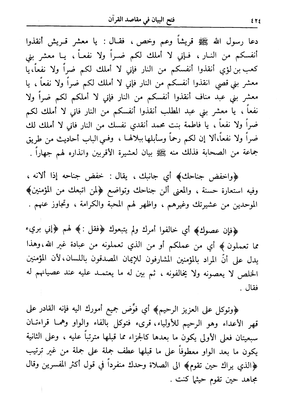 دعا رسول الله - صلى الله عليه وسلم - قريشاً وعم وخص، فقال: " يا معشر قريش أنقذوا أنفسكم من النار، فإني لا أملك لكم ضراً ولا نفعاً، يا معشر بني كعب بن لؤي أنقذوا أنفسكم من النار فإني لا أملك لكم ضراً ولا نفعاً، يا معشر بني قصي أنقذوا أنفسكم من النار فإني لا أملك لكم ضراً ولا نفعاً، يا معشر بني عبد مناف أنقذوا أنفسكم من النار فإني لا أملكم لكم ضراً ولا نفعاً، يا معشر بني عبد المطلب أنقذوا أنفسكم من النار فإني لا أملك لكم ضراً ولا نفعاً، يا فاطمة بنت محمد أنقدي نفسك من النار فإني لا أملك لك ضراً ولا نفعاً، ألا إن لكم رحماً وسأبلها ببلالها "، وفي الباب أحاديث من طريق جماعة من الصحابة فذلك منه - صلى الله عليه وسلم - بيان لعشيرة الأقربين وإنذاره لهم جهاراً.