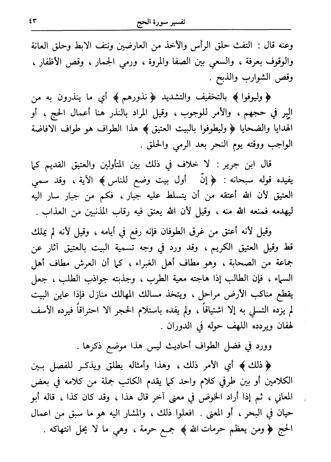 (وليوفوا) بالتخفيف والتشديد (نذورهم) أي ما ينذرون به من البر في حجهم، والأمر للوجوب، وقيل المراد بالنذر هنا أعمال الحج، أو الهدايا والضحايا (وليطوفوا بالبيت العتيق) هذا الطواف هو طواف الإفاضة الواجب ووقته يوم النحر بعد الرمي والحلق.