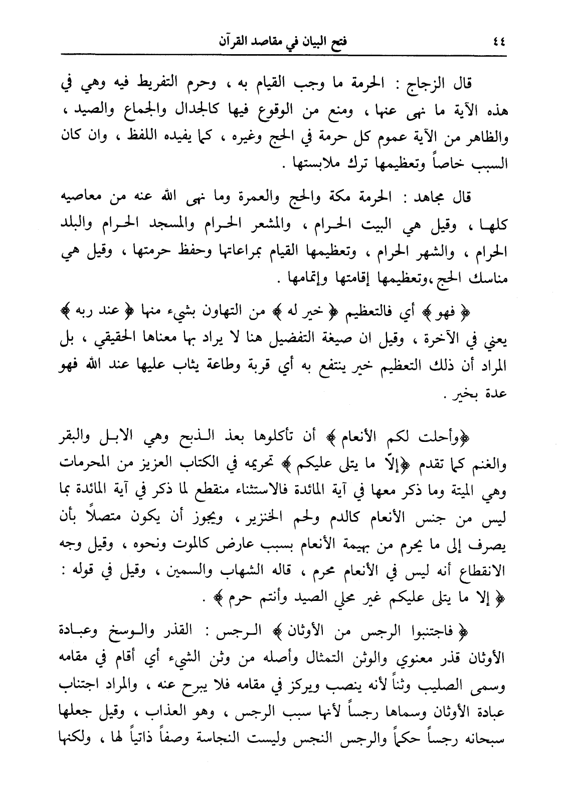 (فاجتنبوا الرجس من الأوثان) الرجس: القذر والوسخ وعبادة الأوثان قذر معنوي والوثن التمثال وأصله من وثن الشيء أي أقام في مقامه وسمى الصليب وثناً لأنه ينصب ويركز في مقامه فلا يبرح عنه، والمراد اجتناب عبادة الأوثان وسماها رجساً لأنها سبب الرجس، وهو العذاب، وقيل جعلها سبحانه رجساً حكماً والرجس النجس وليست النجاسة وصفاً ذاتياً لها، ولكنها