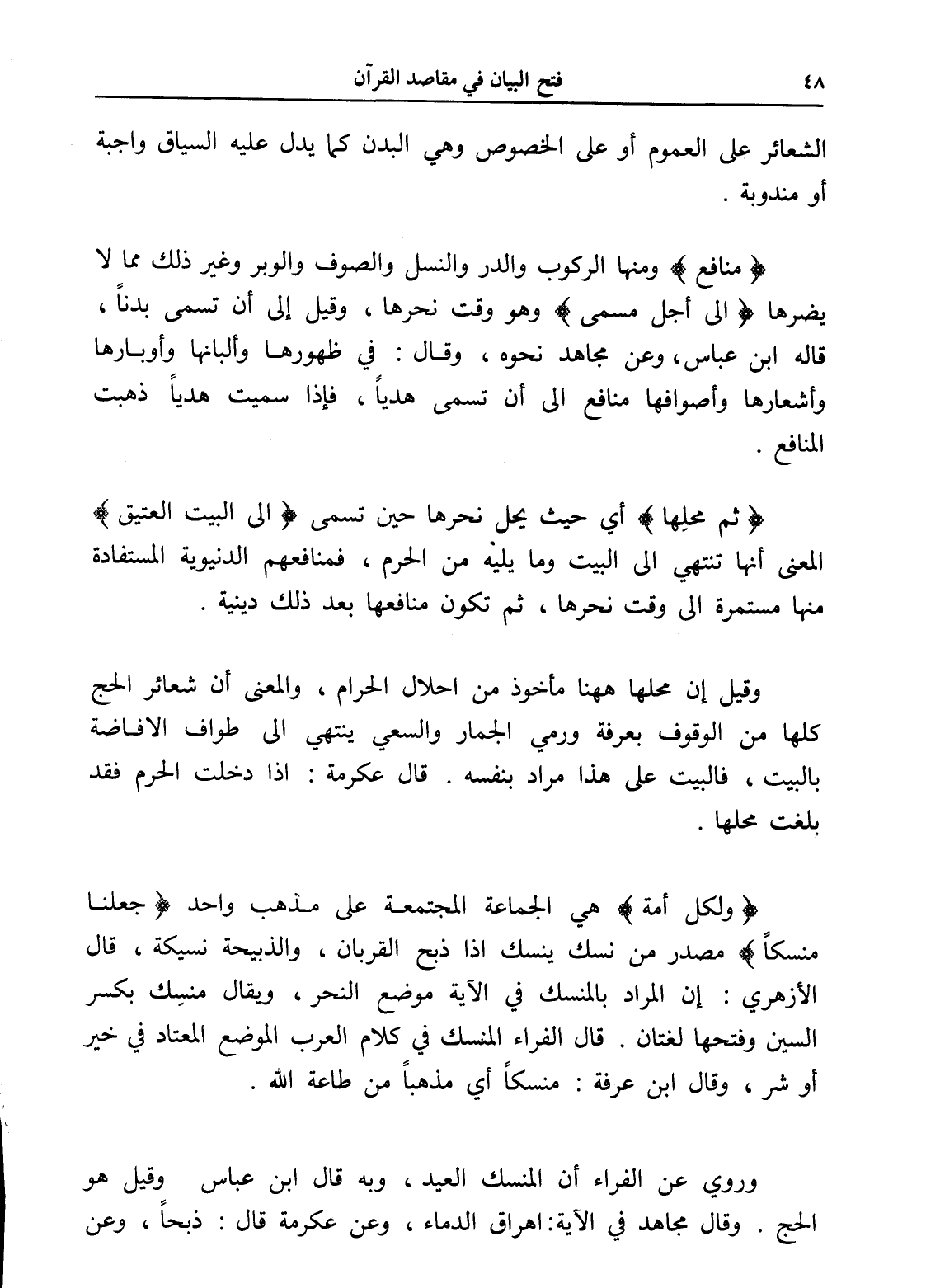 (ولكل أمة) هي الجماعة المجتمعة على مذهب واحد (جعلنا منسكاً) مصدر من نسك ينسك إذا ذبح القربان، والذبيحة نسيكة، قال الأزهري: إن المراد بالمنسك في الآية موضع النحر، ويقال منسِك بكسر السين وفتحها لغتان. قال الفراء المنسك في كلام العرب الموضع المعتاد في خير أو شر، وقال ابن عرفة: منسكاً أي مذهباً من طاعة الله.