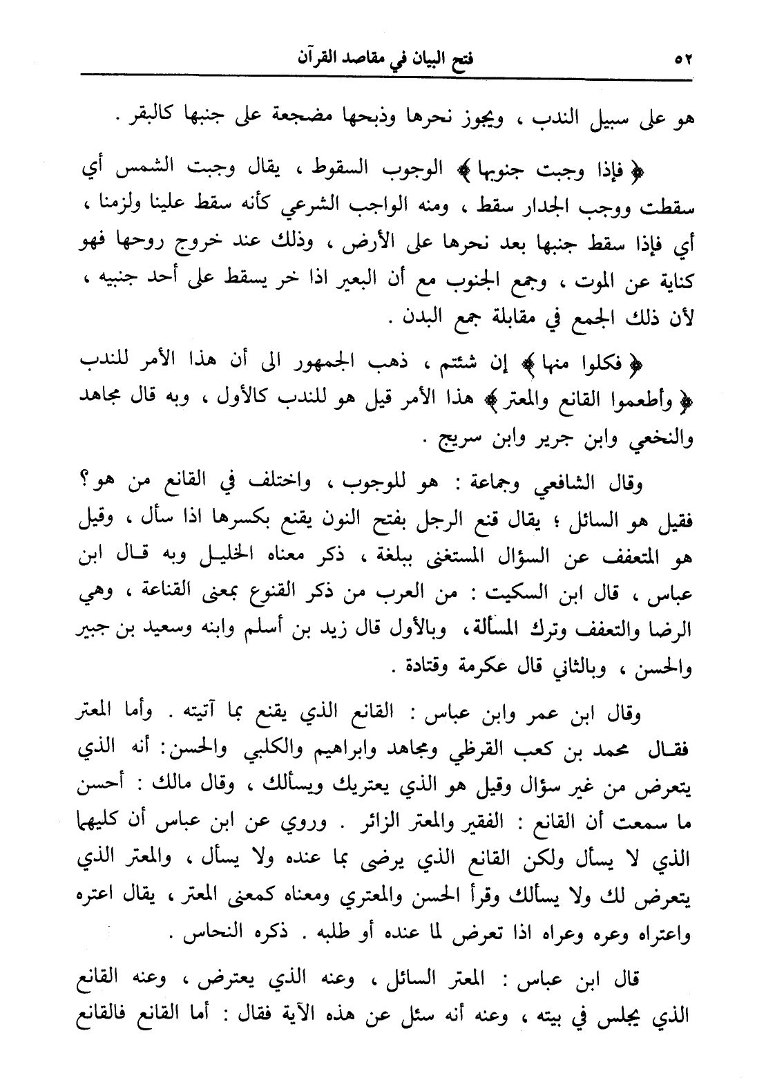 وقال ابن عمر وابن عباس: القانع الذي يقنع بما آتيته. وأما المعتر فقال محمد بن كعب القرظي ومجاهد وإبراهيم والكلبي والحسن: أنه الذي يتعرض من غير سؤال وقيل هو الذي يعتريك ويسألك، وقال مالك: أحسن ما سمعت أن القانع: الفقير والمعتر الزائر. وروي عن ابن عباس أن كليهما الذي لا يسأل ولكن القانع الذي يرضى بما عنده ولا يسأل، والمعتر الذي يتعرض لك ولا يسألك وقرأ الحسن والمعتري ومعناه كمعنى المعتر، يقال اعتره واعتراه وعره وعراه إذا تعرض لما عنده أو طلبه. ذكره النحاس.