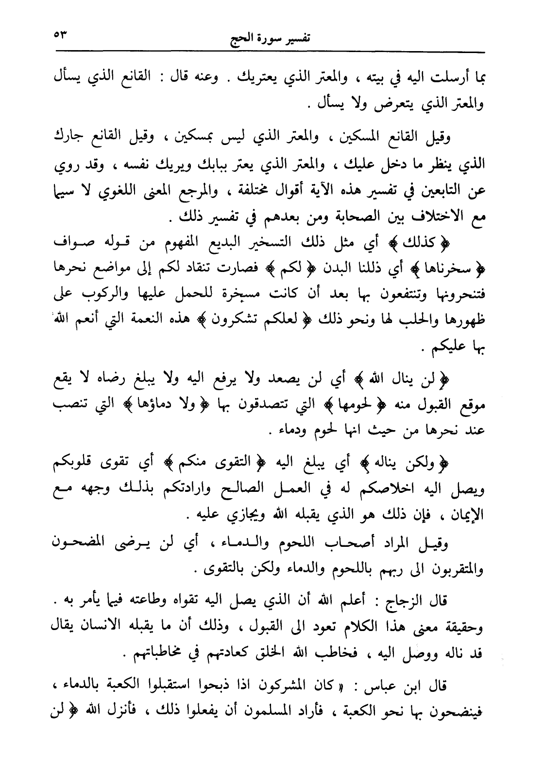 وقيل القانع المسكين، والمعتر الذي ليس بمسكين، وقيل القانع جارك الذي ينظر ما دخل عليك، والمعتر الذي يعتر ببابك ويريك نفسه، وقد روي عن التابعين في تفسير هذه الآية أقوال مختلفة، والمرجع المعنى اللغوي لا سيما مع الاختلاف بين الصحابة ومن بعدهم في تفسير ذلك.