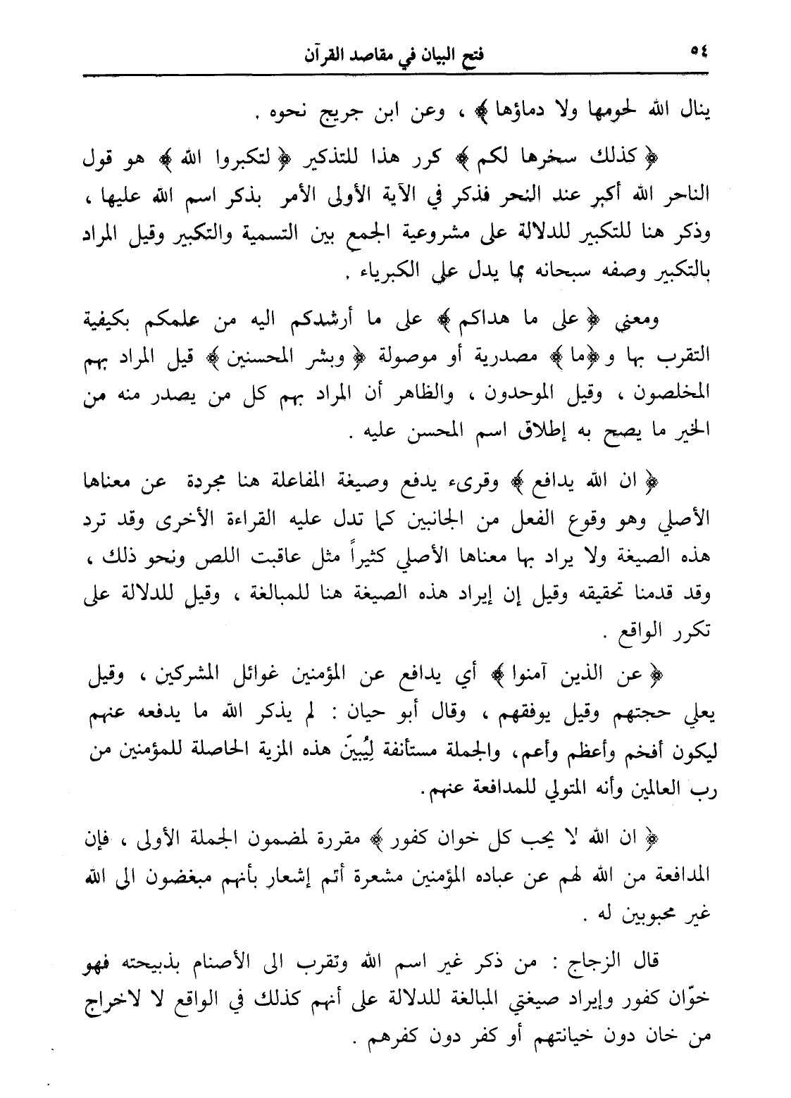 (كذلك سخرها لكلم) كرر هذا للتذكير (لتكبروا الله) هو قول الناحر الله أكبر عند النحر فذكر في الآية الأولى الأمر بذكر اسم الله عليها، وذكر هنا للتكبير للدلالة على مشروعية الجمع بين التسمية والتكبير وقيل المراد بالتكبير وصفه سبحانه بما يدل على الكبرياء.