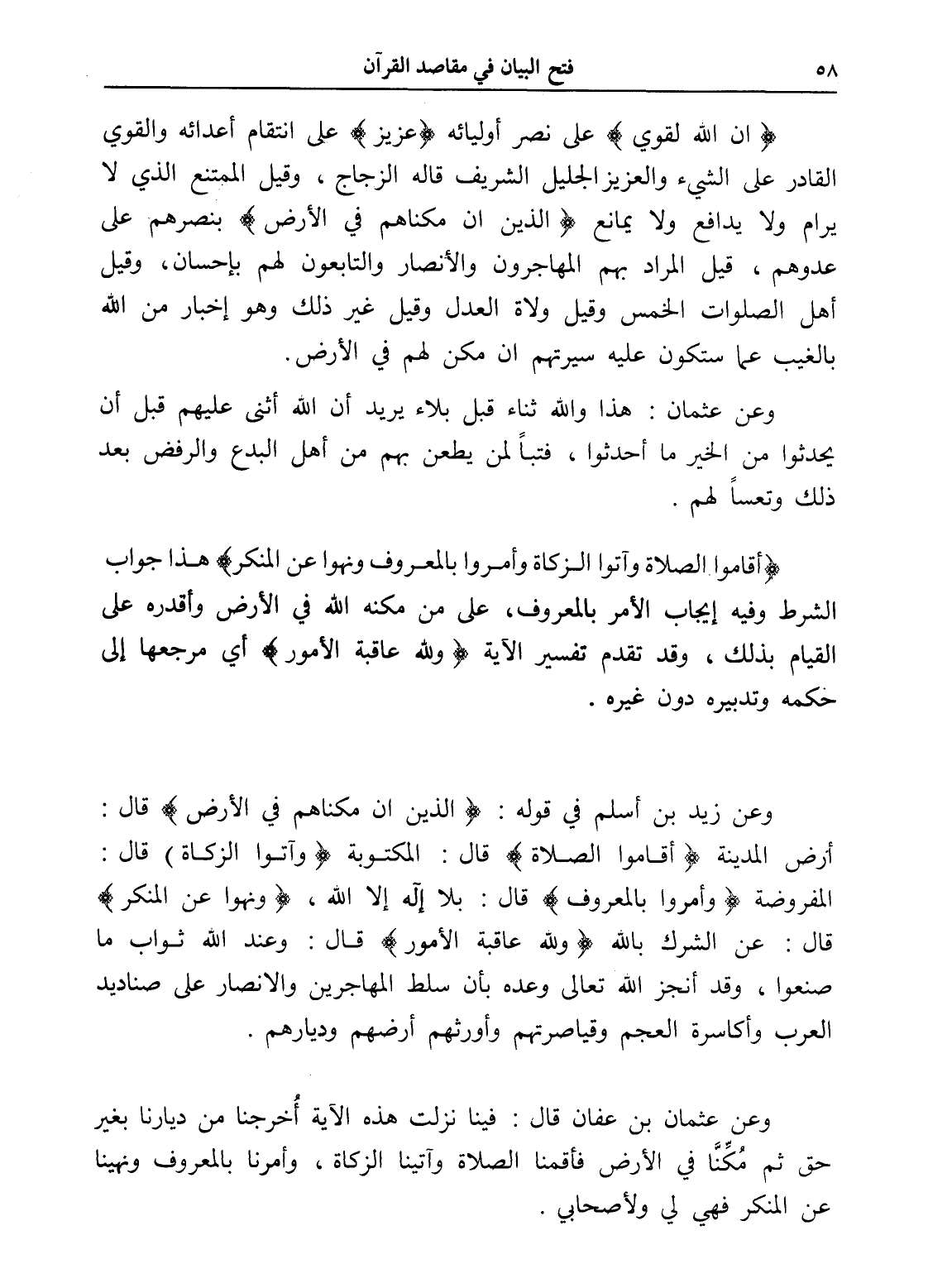 وعن عثمان بن عفان قال: فينا نزلت هذه الآية أُخرجنا من ديارنا بغير حق ثم مُكِّنَّا في الأرض فأقمنا الصلاة وآتينا الزكاة، وأمرنا بالمعروف ونهينا عن المنكر فهي لي ولأصحابي.
