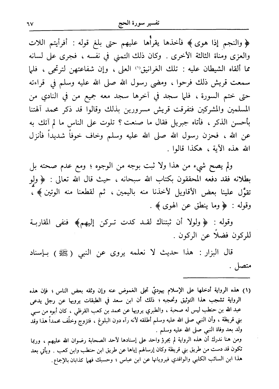 (والنجم إذا هوى) فأخذها يقرأها عليهم حتى بلغ قوله: أفرأيتم اللات والعزى ومناة الثالثة الأخرى. وكان ذلك التمني في نفسه، فجرى على لسانه مما ألقاه الشيطان عليه: تلك الغرانيق (¬1) العلى، وإن شفاعتهن لترتجى، فلما سمعت قريش ذلك فرحوا، ومضى رسول الله صلى الله عليه وسلم في قراءته حتى ختم السورة، فلما سجد في آخرها سجد معه جميع من في النادي من المسلمين والمشركين فتفرقت قريش مسرورين بذلك وقالوا قد ذكر محمد آلهتنا بأحسن الذكر، فأتاه جبريل فقال ما صنعت؟ تلوت على الناس ما لم آتك به عن الله، فحزن رسول الله صلى الله عليه وسلم وخاف خوفاً شديداً فأنزل الله هذه الآية، هكذا قالوا.