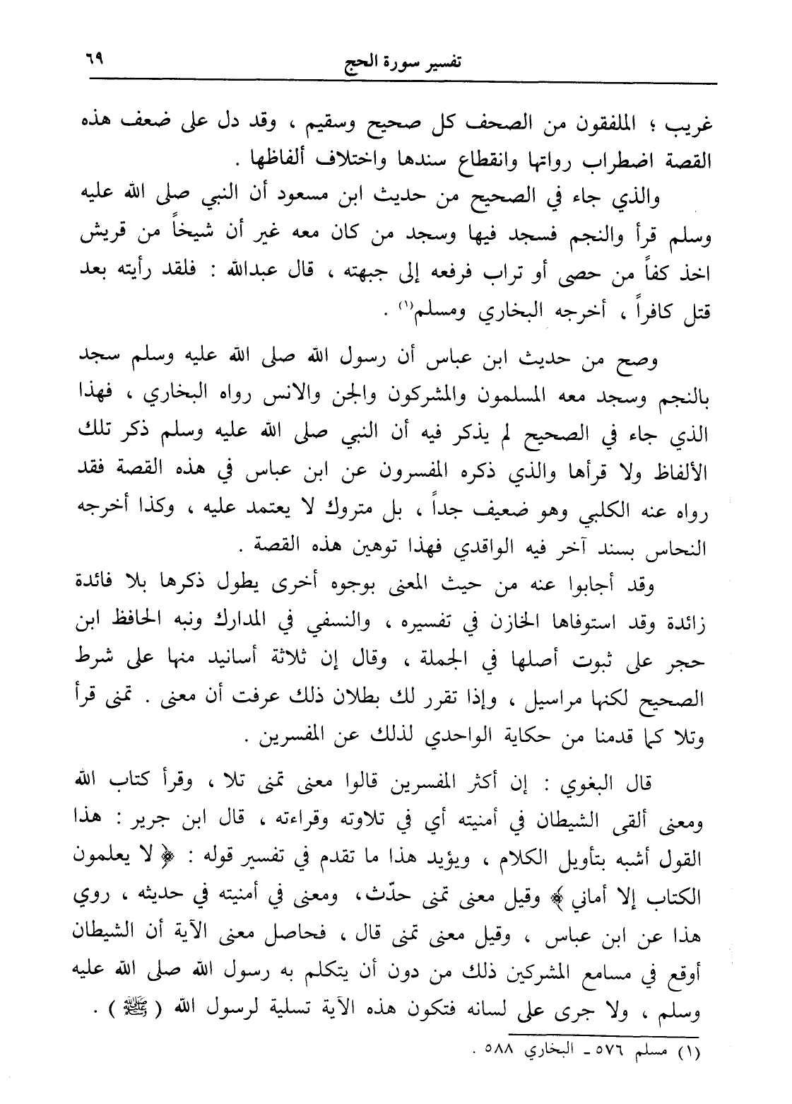 وصح من حديث ابن عباس أن رسول الله صلى الله عليه وسلم سجد بالنجم وسجد معه المسلمون والمشركون والجن والإنس رواه البخاري، فهذا الذي جاء في الصحيح لم يذكر فيه أن النبي صلى الله عليه وسلم ذكر تلك الألفاظ ولا قرأها والذي ذكره الفسرون عن ابن عباس في هذه القصة فقد رواه عنه الكلبي وهو ضعيف جداً، بل متروك لا يعتمد عليه، وكذا أخرجه النحاس بسند آخر فيه الواقدي فهذا توهين هذه القصة.
