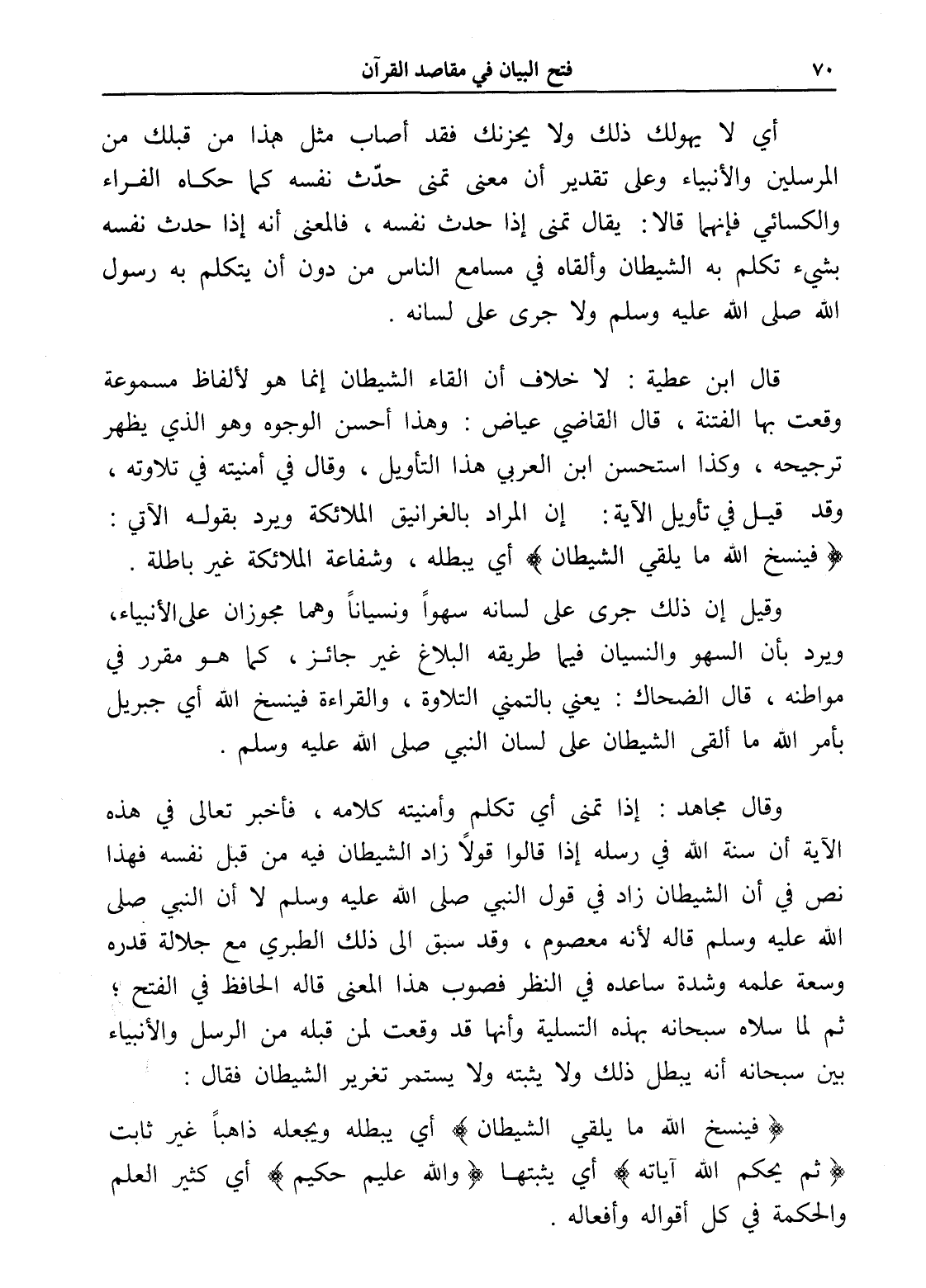 وقال مجاهد: إذا تمنى أي تكلم وأمنيته كلامه، فأخبر تعالى في هذه الآية أن سنة الله في رسله إذا قالوا قولاً زاد الشيطان فيه من قبل نفسه فهذا نص في أن الشيطان زاد في قول النبي صلى الله عليه وسلم لا أن النبي صلى الله عليه وسلم قاله لأنه معصوم، وقد شبق إلى ذلك الطبري مع جلالة قدره وسعة علمه وشدة ساعده في النظر فصوب هذا المعنى قاله الحافظ في الفتح؛ ثم لما سلاه سبحانه بهذه التسلية وأنها قد وقعت لمن قبله من الرسل والأنبياء بين سبحانه أنه يبطل ذلك ولا يثبته ولا يستحر تغرير الشيطان فقال: