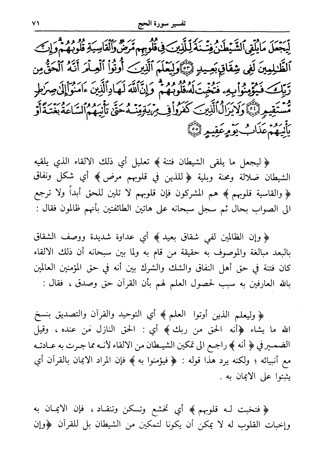 لِيَجْعَلَ مَا يُلْقِي الشَّيْطَانُ فِتْنَةً لِلَّذِينَ فِي قُلُوبِهِمْ مَرَضٌ وَالْقَاسِيَةِ قُلُوبُهُمْ وَإِنَّ الظَّالِمِينَ لَفِي شِقَاقٍ بَعِيدٍ (53) وَلِيَعْلَمَ الَّذِينَ أُوتُوا الْعِلْمَ أَنَّهُ الْحَقُّ مِنْ رَبِّكَ فَيُؤْمِنُوا بِهِ فَتُخْبِتَ لَهُ قُلُوبُهُمْ وَإِنَّ اللَّهَ لَهَادِ الَّذِينَ آمَنُوا إِلَى صِرَاطٍ مُسْتَقِيمٍ (54) وَلَا يَزَالُ الَّذِينَ كَفَرُوا فِي مِرْيَةٍ مِنْهُ حَتَّى تَأْتِيَهُمُ السَّاعَةُ بَغْتَةً أَوْ يَأْتِيَهُمْ عَذَابُ يَوْمٍ عَقِيمٍ (55)