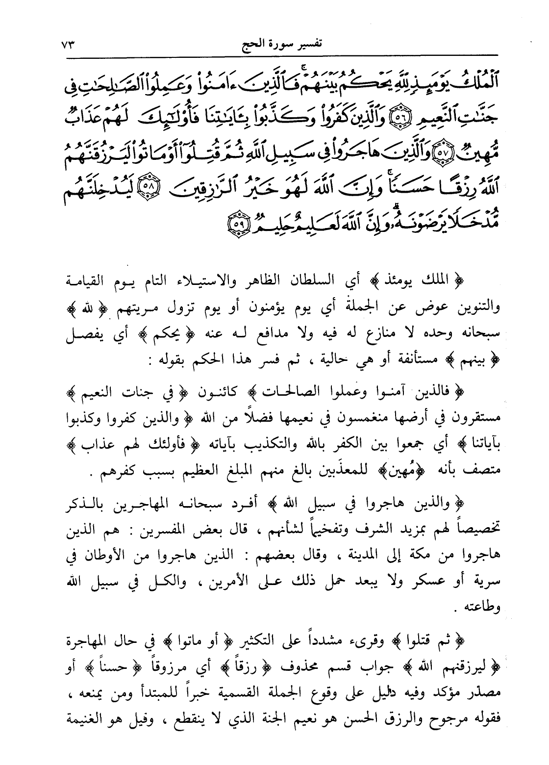 الْمُلْكُ يَوْمَئِذٍ لِلَّهِ يَحْكُمُ بَيْنَهُمْ فَالَّذِينَ آمَنُوا وَعَمِلُوا الصَّالِحَاتِ فِي جَنَّاتِ النَّعِيمِ (56) وَالَّذِينَ كَفَرُوا وَكَذَّبُوا بِآيَاتِنَا فَأُولَئِكَ لَهُمْ عَذَابٌ مُهِينٌ (57) وَالَّذِينَ هَاجَرُوا فِي سَبِيلِ اللَّهِ ثُمَّ قُتِلُوا أَوْ مَاتُوا لَيَرْزُقَنَّهُمُ اللَّهُ رِزْقًا حَسَنًا وَإِنَّ اللَّهَ لَهُوَ خَيْرُ الرَّازِقِينَ (58) لَيُدْخِلَنَّهُمْ مُدْخَلًا يَرْضَوْنَهُ وَإِنَّ اللَّهَ لَعَلِيمٌ حَلِيمٌ (59)