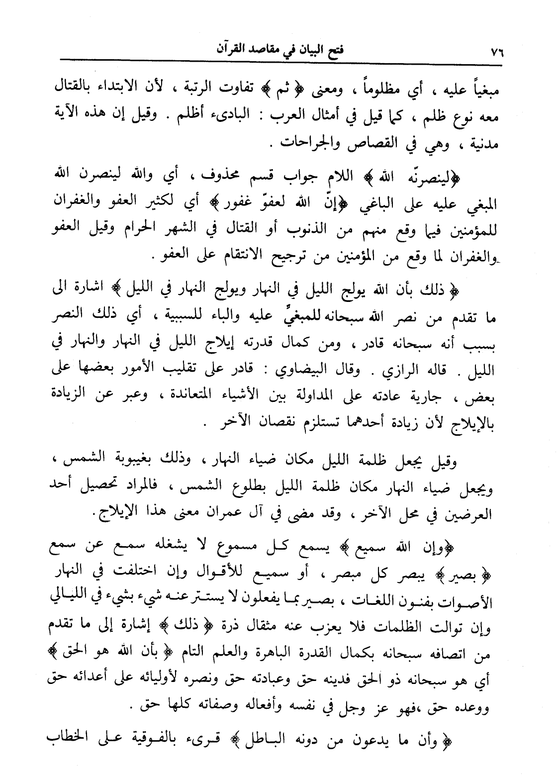 (ذلك بأن الله يولج الليل في النهار ويولج النهار في الليل) إشارة إلى ما تقدم من نصر الله سبحانه للمبغي عليه والباء للسببية، أي ذلك النصر بسبب أنه سبحانه قادر، ومن كمال قدرته إيلاج الليل في النهار والنهار في الليل. قاله الرازي. وقال البيضاوي: قادر على تقليب الأمور بعضها على بعض، جارية عادته على المداولة بين الأشياء المتعاندة، وعبر عن الزيادة بالإيلاج لأن زيادة أحدهما تستلزم نقصان الآخر.