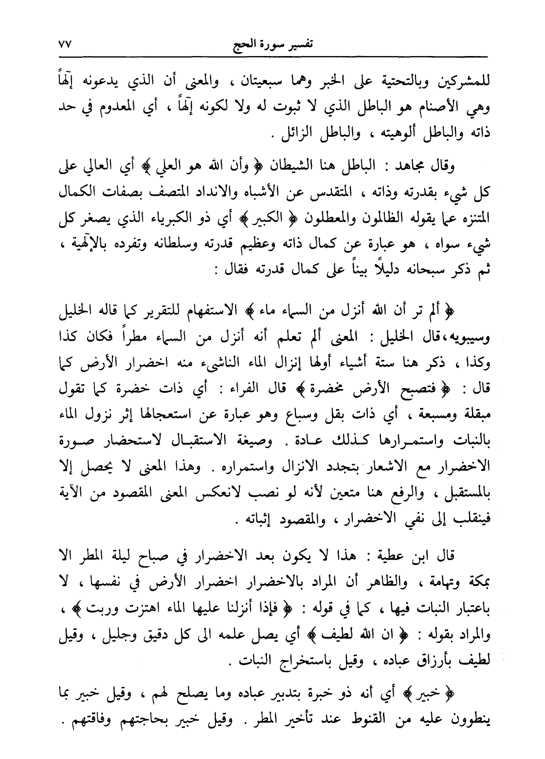 قال ابن عطية: هذا لا يكون بعد الاخضرار في صباح ليلة المطر إلا بمكة وتهامة، والظاهر أن المراد بالاخضرار اخضرار الأرض في نفسها، لا باعتبار النبات فيها، كما في قوله: (فإذا أنزلنا عليها الماء اهتزت وربت)، والمراد بقوله: (إن الله لطيف) أي يصل علمه إلى كل دقيق وجليل، وقيل لطيف بأرزاق عباده، وقيل باستخراج النبات.
