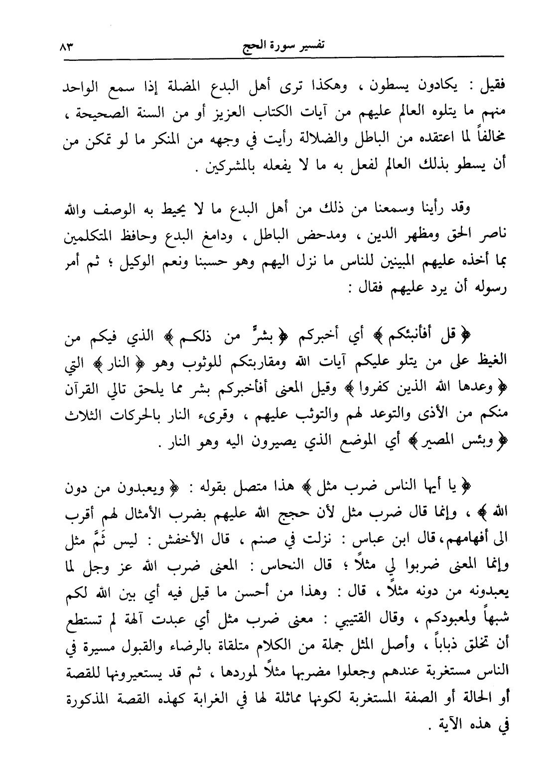 وقد رأينا وسمعنا من ذلك من أهل البدع ما لا يحيط به الوصف والله ناصر الحق ومظهر الدين، ومدحض الباطل، ودامغ البدع وحافظ المتكلمين بما أخذه عليهم المبينين للناس ما نزل إليهم وهو حسبنا ونعم الوكيل؛ ثم أمر رسوله أن يرد عليهم فقال: