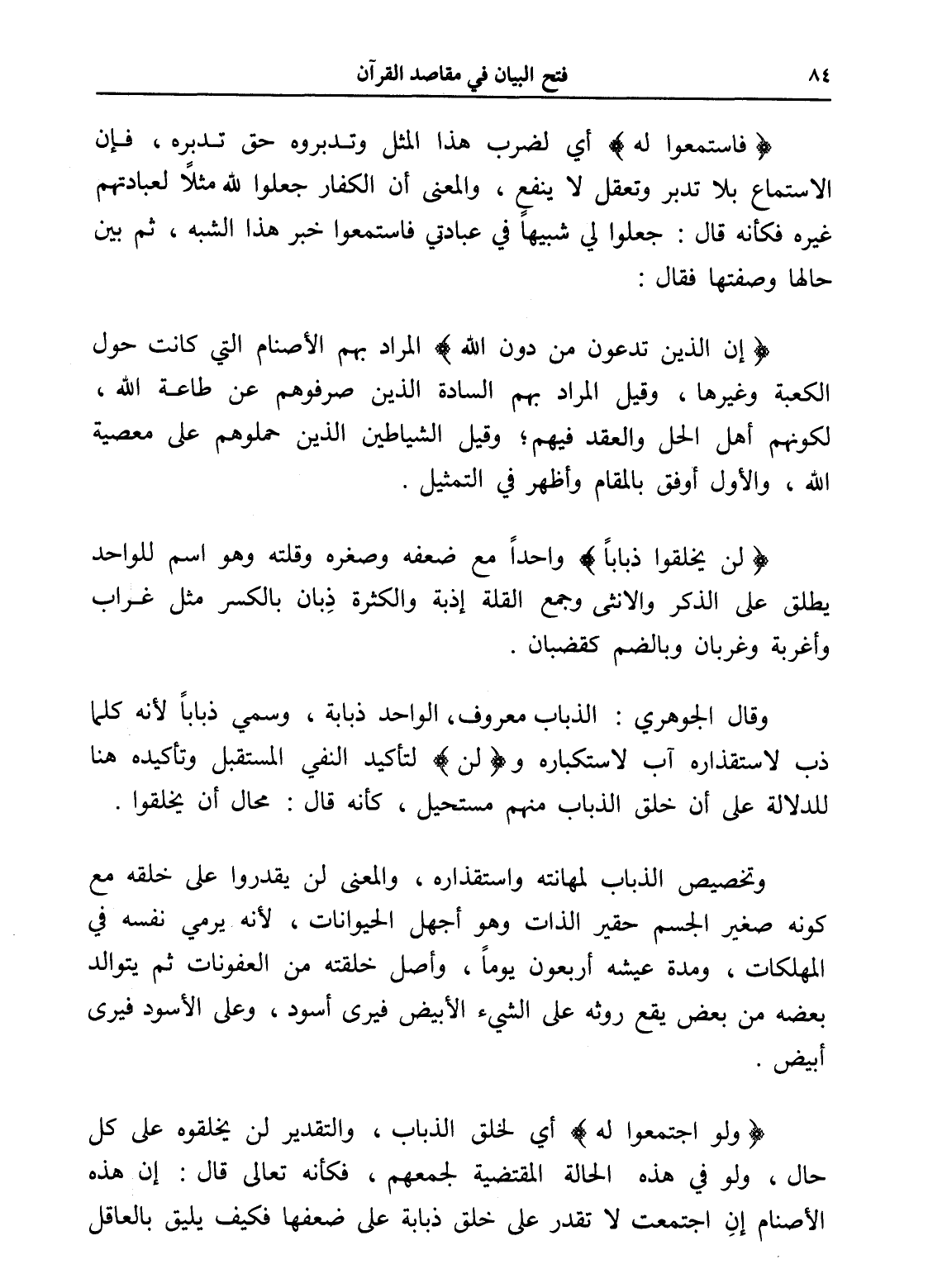 وتخصيص الذباب لمهانته واستقذاره، والمعنى لن يقدروا على خلقه مع كونه صغير الجسم حقير الذات وهو أجهل الحيوانات، لأنه يرمي نفسه في المهلكات، ومدة عيشه أربعون يوماً، وأصل خلقته من العفونات ثم يتوالد بعضه من بعض يقع روثه على الشيء الأبيض فيرى أسود، وعلى الأسود فيرى أبيض.