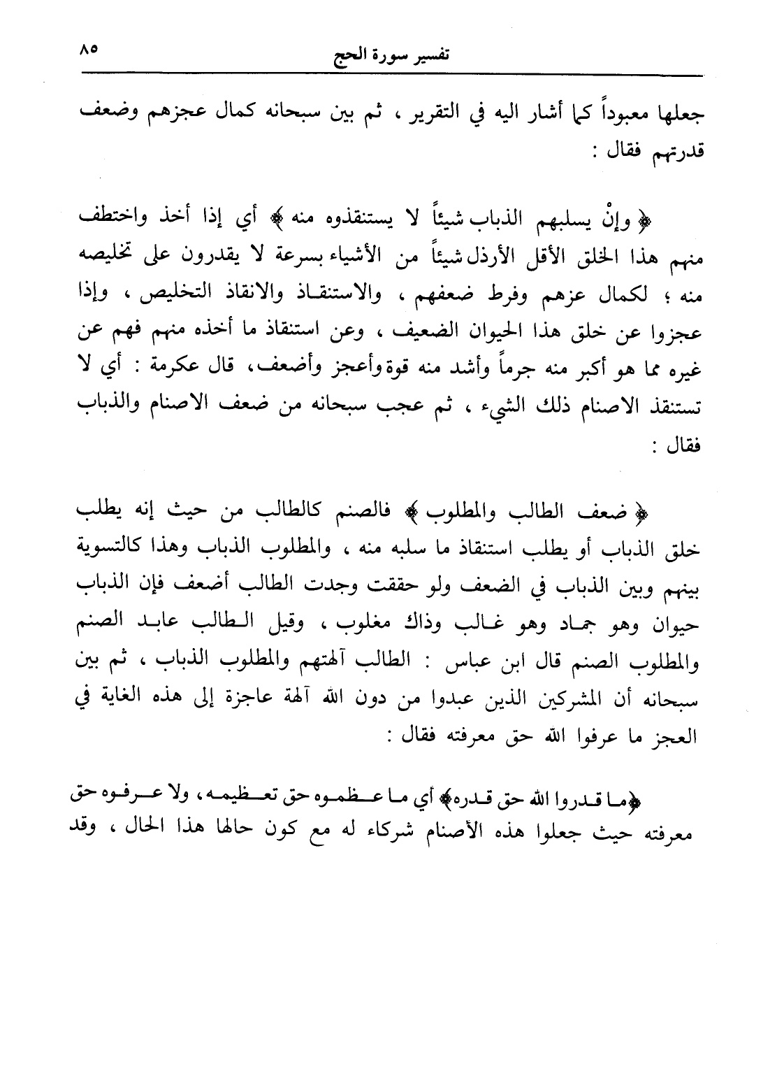 (ضعف الطالب والمطلوب) فالصنم كالطالب من حيث إنه يطلب خلق الذباب أو يطلب استنقاذ ما سلبه منه، والمطلوب الذباب وهذا كالتسوية بينهم وبين الذباب في الضعف ولو حققت وجدت الطالب أضعف فإن الذباب حيوان وهو جماد وهو غالب وذاك مغلوب، وقيل الطالب عابد الصنم والمطلوب الصنم قال ابن عباس: الطالب آلهتهم والمطلوب الذباب، ثم بين سبحانه أن المشركين الذين عبدوا من دون الله آلهة عاجزة إلى هذه الغاية في العجز ما عرفوا الله حق معرفته فقال: