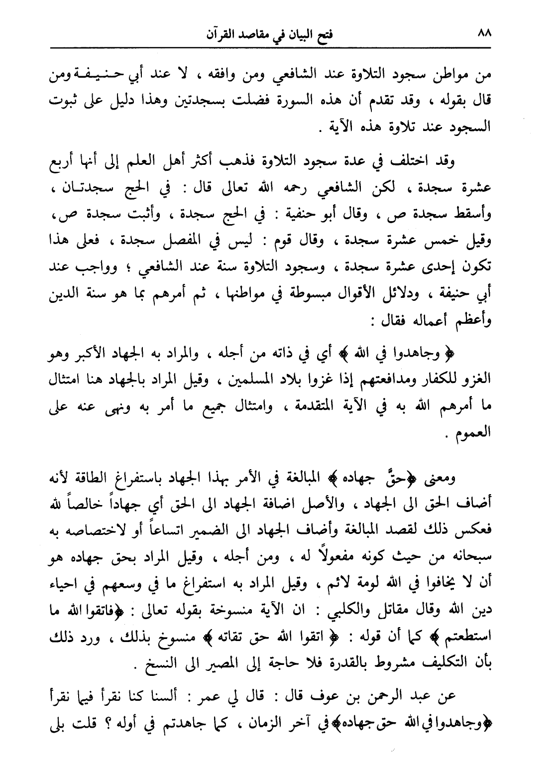 ومعنى (حقَّ جهاده) المبالغة في الأمر بهذا الجهاد باستفراغ الطاقة لأنه أضاف الحق إلى الجهاد، والأصل إضافة الجهاد إلى الحق أي جهاداً خالصاً لله فعكس ذلك لقصد المبالغة وأضاف الجهاد إلى الضمير اتساعاً أو لاختصاصه به سبحانه من حيث كونه مفعولاً له، ومن أجله، وقيل المراد بحق جهاده هو أن لا يخافوا في الله لومة لائم، وقيل المراد به استفراغ ما في وسعهم في إحياء دين الله وقال مقاتل والكلبي: إن الآية منسوخة بقوله تعالى: (فاتقوا الله ما استطعتم) كما أن قوله: (اتقوا الله حق تقاته) منسوخ بذلك، ورد ذلك بأن التكليف مشروط بالقدرة فلا حاجة إلى المصير إلى النسخ.