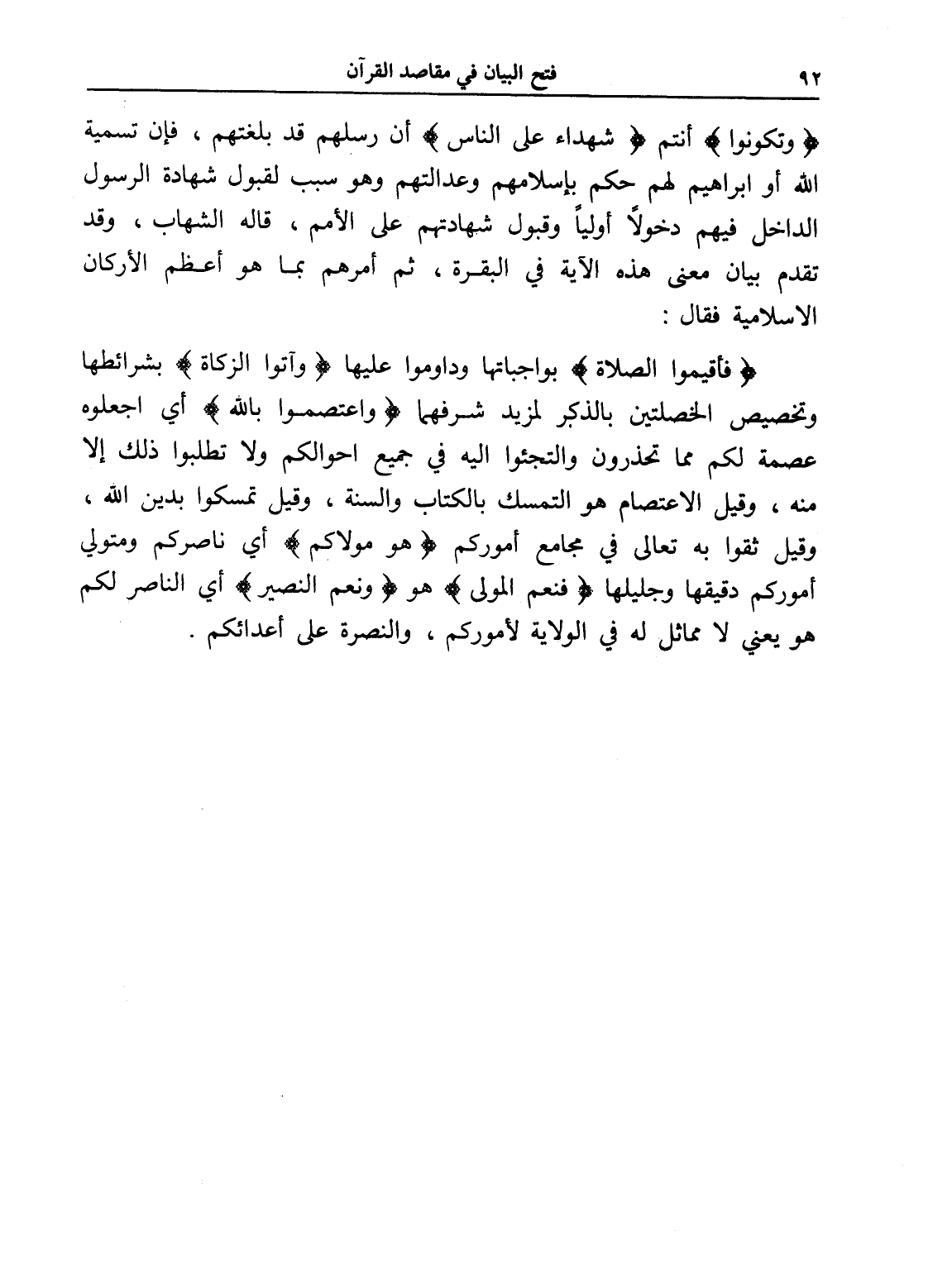 (فأقيموا الصلاة) بواجباتها وداوموا عليها (وآتوا الزكاة) بشرائطها وتخصيص الخصلتين بالذكر لمزيد شرفهما (واعتصموا بالله) أي اجعلوه عصمة لكم مما تحذرون والتجئوا إليه في جميع أحوالكم ولا تطلبوا ذلك إلا منه، وقيل الاعتصام هو التمسك بالكتاب والسنة، وقيل تمسكوا بدين الله، وقيل ثقوا به تعالى في مجامع أموركم (هو مولاكم) أي ناصركم ومتولي أموركم دقيقها وجليلها (فنعم المولى) هو (ونعم النصير) أي الناصر لكم هو يعني لا مماثل له في الولاية لأموركم، والنصرة على أعدائكم.