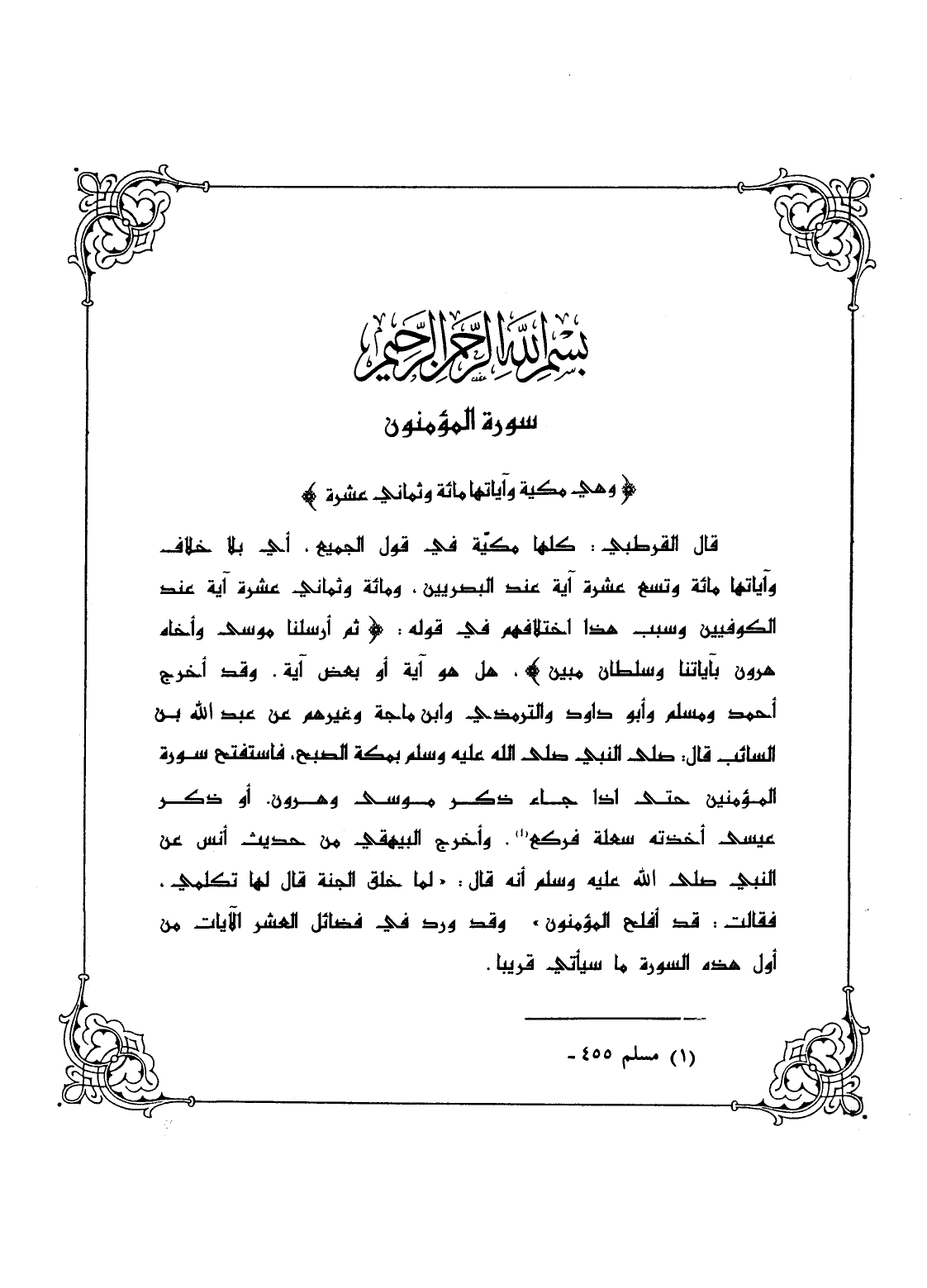 قال القرطبي: كلها مكيّة في قول الجميع. أي بلا خلاف وآياتها مائة وتسع آية عند البصريين، ومائة وثماني عشرة آية عند الكوفيين وسبب هذا اختلافهم في قوله: (ثُمَّ أَرْسَلْنَا مُوسَى وَأَخَاهُ هَارُونَ بِآيَاتِنَا وَسُلْطَانٍ مُبِينٍ)، هل هو آية أو بعض آية. وقد أخرج أحمد ومسلم وأبو داود والترمذي وابن ماجه وغيرهم عن عبد الله بن السائب قال: صلى النبي صلى الله عليه وسلم بمكة الصبح، فاستفتح سورة المؤمنين حتى إذا جاء ذكر موسى وهارون. أو ذكر عيسى أخذته سلعة فركع (¬1). وأخرج البيهقي من حديث أنس عن النبي صلى الله عليه وسلم أنه قال: " لما خلق الجنة قال لها تكلمي، فقالت: قد أفلح المؤمنون " وقد ورد في فضائل العشر الآيات من أول هذه السورة ما سيأتي قريباً.