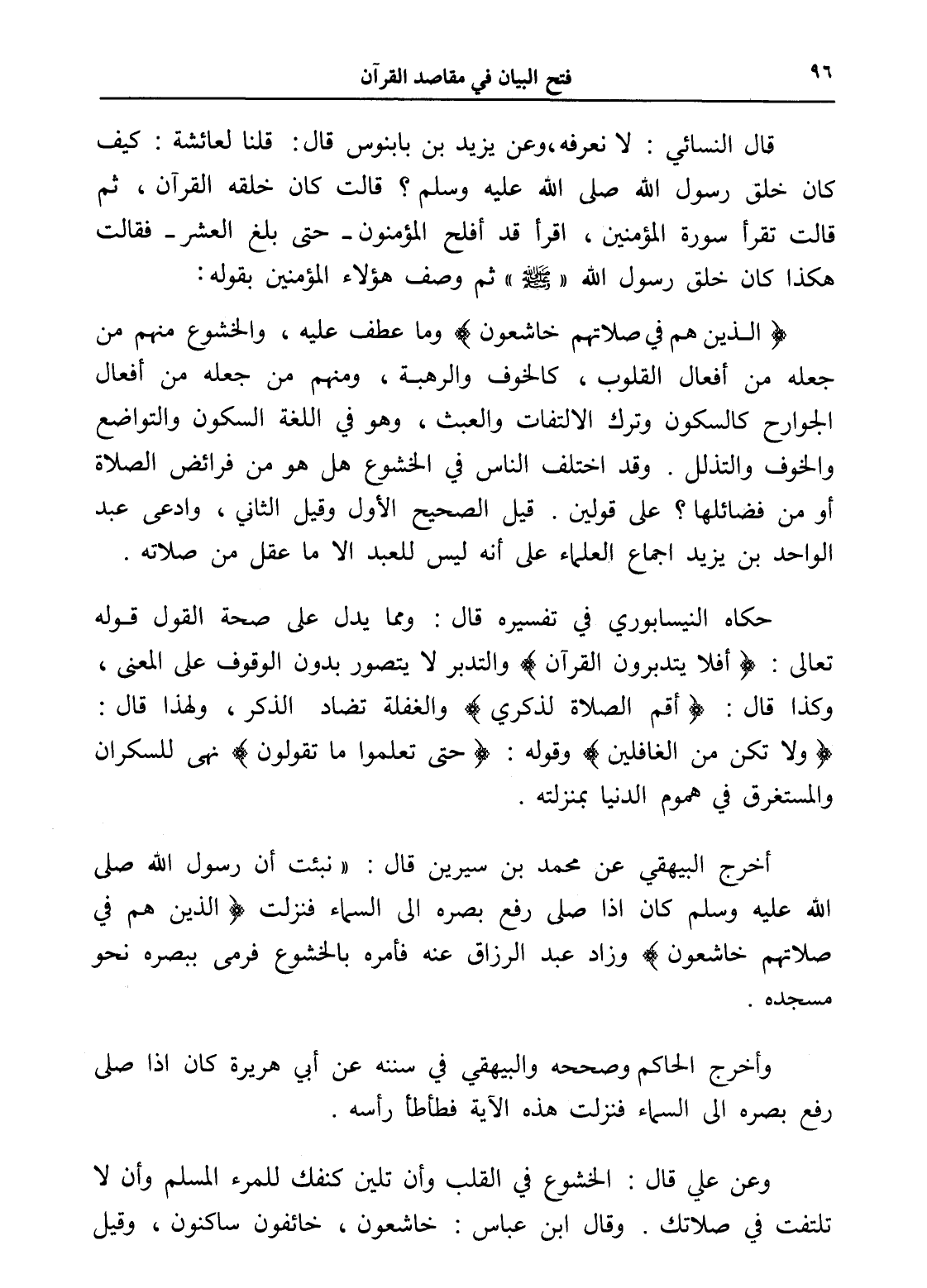 قال النسائي: لا نعرفه، وعن يزيد بن بابنوس قال: قلنا لعائشة: كيف كان خلق رسول الله صلى الله عليه وسلم؟ قالت كان خلقه القرآن، ثم قالت تقرأ سورة المؤمنين، اقرأ قد أفلح المؤمنون -حتى بلغ العشر- فقالت هكذا كان خلق رسول الله " - صلى الله عليه وسلم - " ثم وصف هؤلاء المؤمنين بقوله: