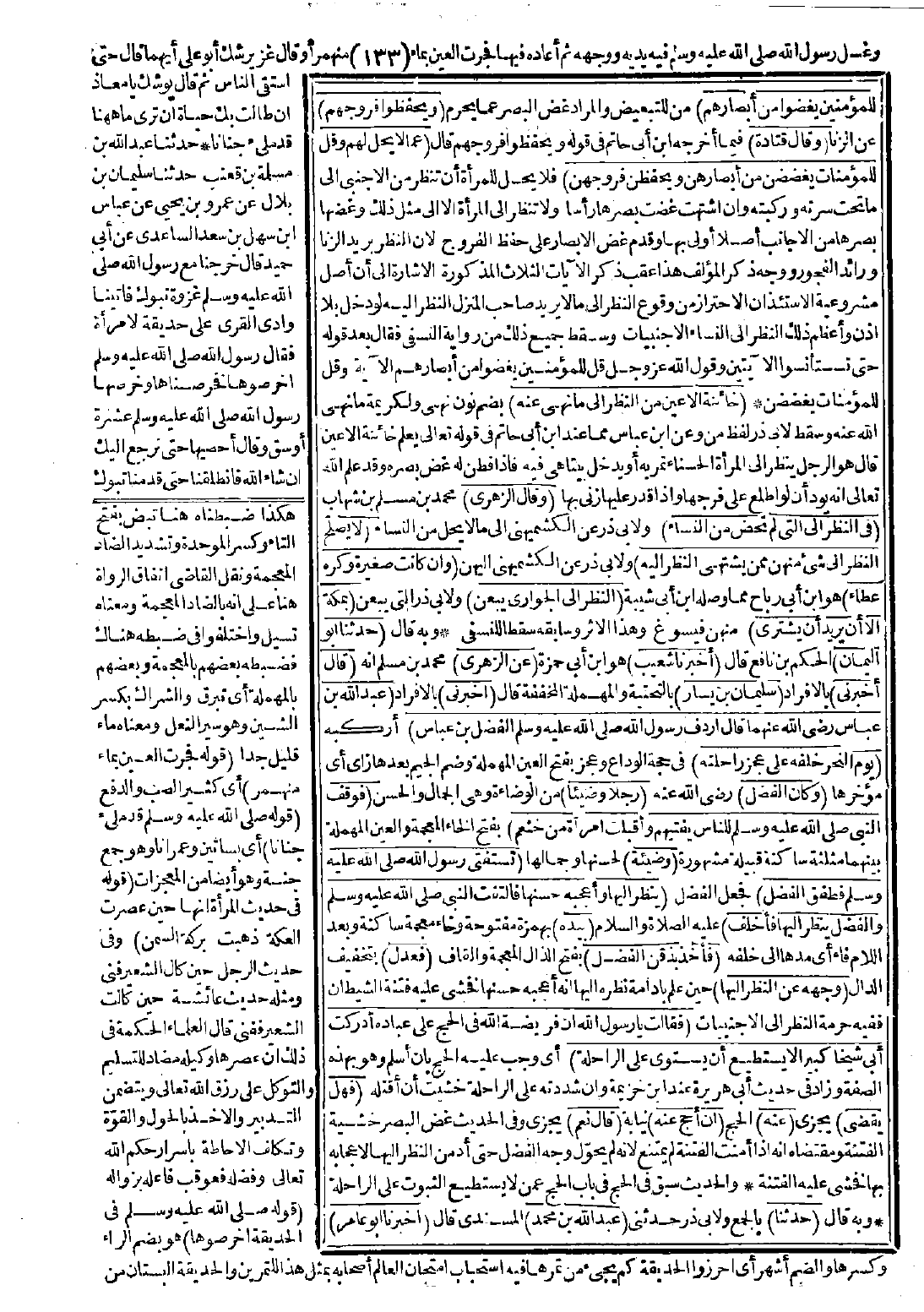 وبه قال: (حدّثنا أبو اليمان) الحكم بن نافع قال: (أخبرنا شعيب) هو ابن أبي حمزة (عن الزهري) محمد بن مسلم أنه (قال: أخبرني) بالإفراد (سليمان بن يسار) بالتحتية والمهملة المخففة قال: (أخبرني) بالإفراد (عبد الله بن عباس -رضي الله عنهما- قال: أردف رسول الله -صَلَّى اللَّهُ عَلَيْهِ وَسَلَّمَ- الفضل بن عباس) أركبه (يوم النحر خلفه على عجز راحلته) في حجة الوداع وعجز بفتح العين المهملة وضم الجيم بعدها زاي أي مؤخرها (وكان الفضل) -رضي الله عنه- (رجلاً وضيئًا) من الوضاءة وهي الجمال والحسن (فوقف النبي -صَلَّى اللَّهُ عَلَيْهِ وَسَلَّمَ- للناس يفتيهم وأقبلت امرأة من خثعم) بفتح الخاء المعجمة والعين المهملة بينهما مثلثة ساكنة قبيلة مشهورة (وضيئة) لحسنها وجمالها (تستفتي رسول الله -صَلَّى اللَّهُ عَلَيْهِ وَسَلَّمَ- فطفق الفضل) فجعل الفضل (ينظر إليها وأعجبه حسنها فالتفت النبي -صَلَّى اللَّهُ عَلَيْهِ وَسَلَّمَ- والفضل ينظر إليها فأخلف) عليه الصلاة والسلام (بيده) بهمزة مفتوحة وخاء معجمة ساكنة وبعد اللام فاء أي مدها إلى خلفه (فأخذ بذقن الفضل) بفتح الذال المعجمة والقاف (فعدل) بتخفيف الدال (وجهه عن النظر إليها) حين علم بإدامة نظره إليها أنه أعجبه حسنها فخشي عليه فتنة الشيطان ففيه حرمة