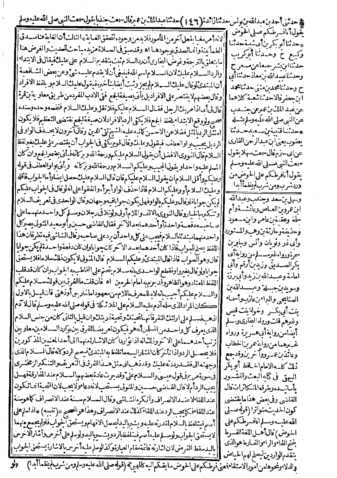قال النووي: الأفضل أن يقول السلام عليكم ورحمة الله وبركاته فيأتي بضمير الجمع وإن كان المسلّم عليه واحدًا ويقول المجيب وعليكم السلام ورحمة الله وبركاته، ويأتي بواو العطف في قوله وعليكم، وأقل السلام أن يقول السلام عليكم فإن قال: السلام عليك حصل أيضًا، وأما الجواب فأقله وعليك السلام أو وعليكم السلام، فإذا حذف الواو أجرأه واتفقوا على أنه لو قال في الجواب: عليكم لم يكن جوابًا فلو قال: وعليكم بالواو فهل يكون جوابًا؟ فيه وجهان. وقال الواحدي في تعريف السلام وتنكيره بالخيار، وقال النووي: بالألف واللام أولى، ولو تلاقى رجلان وسلم كل واحد منهما على صاحبه دفعة واحدة أو أحدهما بعد الآخر فقال القاضي حسين وأبو سعيد المتولي: يصير كل واحد منهما مبتدئًا بالسلام فيجب على كل واحد أن يرد على صاحبه.