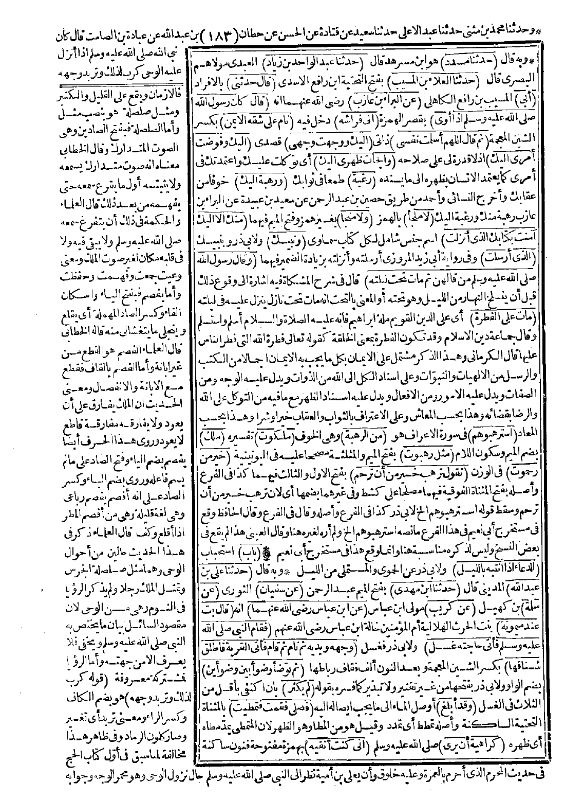 وبه قال: (حدّثنا علي بن عبد الله) المديني قال: (حدّثنا ابن مهدي) بفتح الميم عبد الرحمن (عن سفيان) الثوري (عن سلمة) بن كهيل (عن كريب) مولى ابن عباس (عن ابن عباس -رضي الله عنهما-) أنه (قال: بت عند ميمونة) بنت الحارث الهلالية أم المؤمنين خالة ابن عباس رضي الله عنهم (فقام النبي -صَلَّى اللَّهُ عَلَيْهِ وَسَلَّمَ- فأتى حاجته غسل) ولأبي ذر: فغسل (وجهه ويديه ثم نام ثم قام فأتى القِربة فأطلق شناقها) بكسر الشين المعجمة وبعد النون ألف فقاف رباطها (ثم توضأ وضوءًا بين وضوءَين) بضم الواو، ولأبي ذر بفتحها من غير تقتير ولا تبذير كما فسره بقوله (لم يكثر) بأن اكتفى بأقل من الثلاث في الغسل (وقد أبلغ) أوصل الماء إلى ما يجب إيصاله إليه (فصلّى فقمت فتمطيت) بالمثناة التحتية الساكنة وأصله تمطط أي تمدد وقيل هو من المطا وهو الظهر لأن المتمطي يمدّ مطاه أي ظهره (كراهية أن يرى) -صَلَّى اللَّهُ عَلَيْهِ وَسَلَّمَ- (أني كنت أنقيه) بهمزة مفتوحة فنون ساكنة