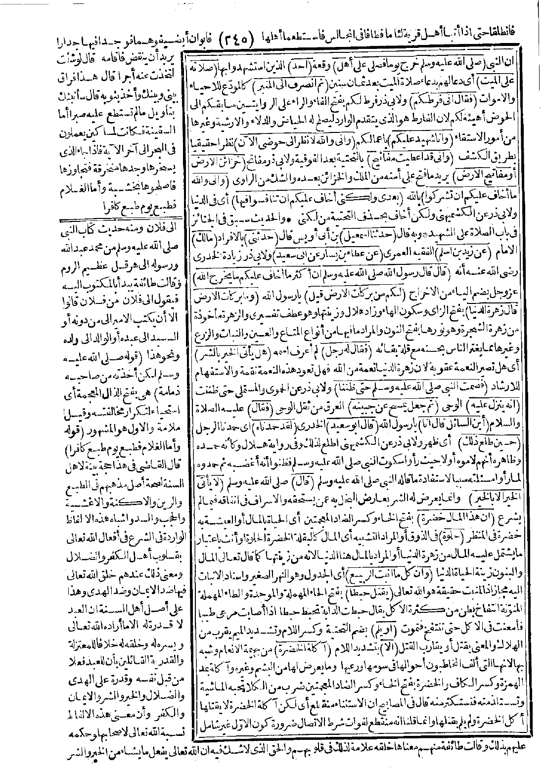 (إن أكثر ما أخاف عليكم ما يخرج الله) عز وجل بضم الياء من الإِخراج (لكم من بركات الأرض قيل): يا رسول الله (وما بركات الأرض؟ قال: زهرة الدنيا) بفتح الزاي وسكون الهاء وزاد هلال وزينتها وهو عطف تفسيري والزهرة مأخوذة من زهرة الشجرة وهو نورها بفتح النون والمراد ما فيها من أنواع المتاع والعين والنبات والزرع وغيرها مما يغتر الناس بحسنه مع قلة بقائه (فقال له رجل): لم أعرف اسمه (هل يأتي الخير الشر)؟ أي هل تصير النعمة عقوبة لأن زهرة الدنيا نعمة من الله فهل تعود هذه النعمة نقمة والاستفهام للإرشاد (فصمت النبي -صَلَّى اللَّهُ عَلَيْهِ وَسَلَّمَ- حتى ظننا) ولأبي ذر عن الحموي والمستملي حتى ظننت (أنه ينزل عليه) الوحي (ثم جعل يمسح عن جبينه) العرق من ثقل الوحي (فقال) عليه الصلاة والسلام: (أين السائل؟ قال: أنا) يا رسول الله (قال أبو سعيد) الخدري: (لقد حمدناه) أي حمدنا الرجل (حين طلع ذلك) أي ظهر ولأبي ذر عن الكشميهني اطلع لذلك وفي رواية هلال وكأنه حمده وظاهره أنهم لاموه أولاً حيث رأوا سكوت النبي -صَلَّى اللَّهُ عَلَيْهِ وَسَلَّمَ- فظنوا أنه أغضبه ثم حمدوه لما رأوا مسألته سببًا لاستفادة ما قاله النبي -صَلَّى اللَّهُ عَلَيْهِ وَسَلَّمَ- (قال) -صَلَّى اللَّهُ عَلَيْهِ وَسَلَّمَ-: (لا يأتي الخير إلا بالخير) وإنما يعرض له الشر بعارض البخل به عمن يستحقه والإسراف في إنفاقه فيما لم يشرع (إن هذا المال خضرة) بفتح الخاء وكسر الضاد المعجمتين أي الحياة بالمال أو المعيشة به خضرة في المنظر (حلوة) في الذوق أو المراد التشبيه أي المال كالبقلة الخضرة الحلوة أو أنث باعتبار ما يشتمل عليه المال من زهرة الدنيا أو المراد بالمال هنا الدنيا لأنه من زينتها كما قال تعالى: {المال والبنون زينة الحياة الدنيا} [الكهف: 46] (وإن كل ما أنبت الربيع) أي الجدول وهو النهر الصغير وإسناد الإنبات إليه مجاز إذ المنبت حقيقة هو الله تعالى (يقتل حبطًا) بفتح الحاء المهملة والموحدة والطاء المهملة المنوّنة انتفاخ بطن من كثرة الأكل يقال حبطت الدابة تحبط حبطًا إذا أصابت مرعى طيبًا فأمعنت في الأكل حتى تنتفخ فتموت (أو يلم) بضم التحتية وكسر اللام وتشديد الميم يقرب من الهلاك