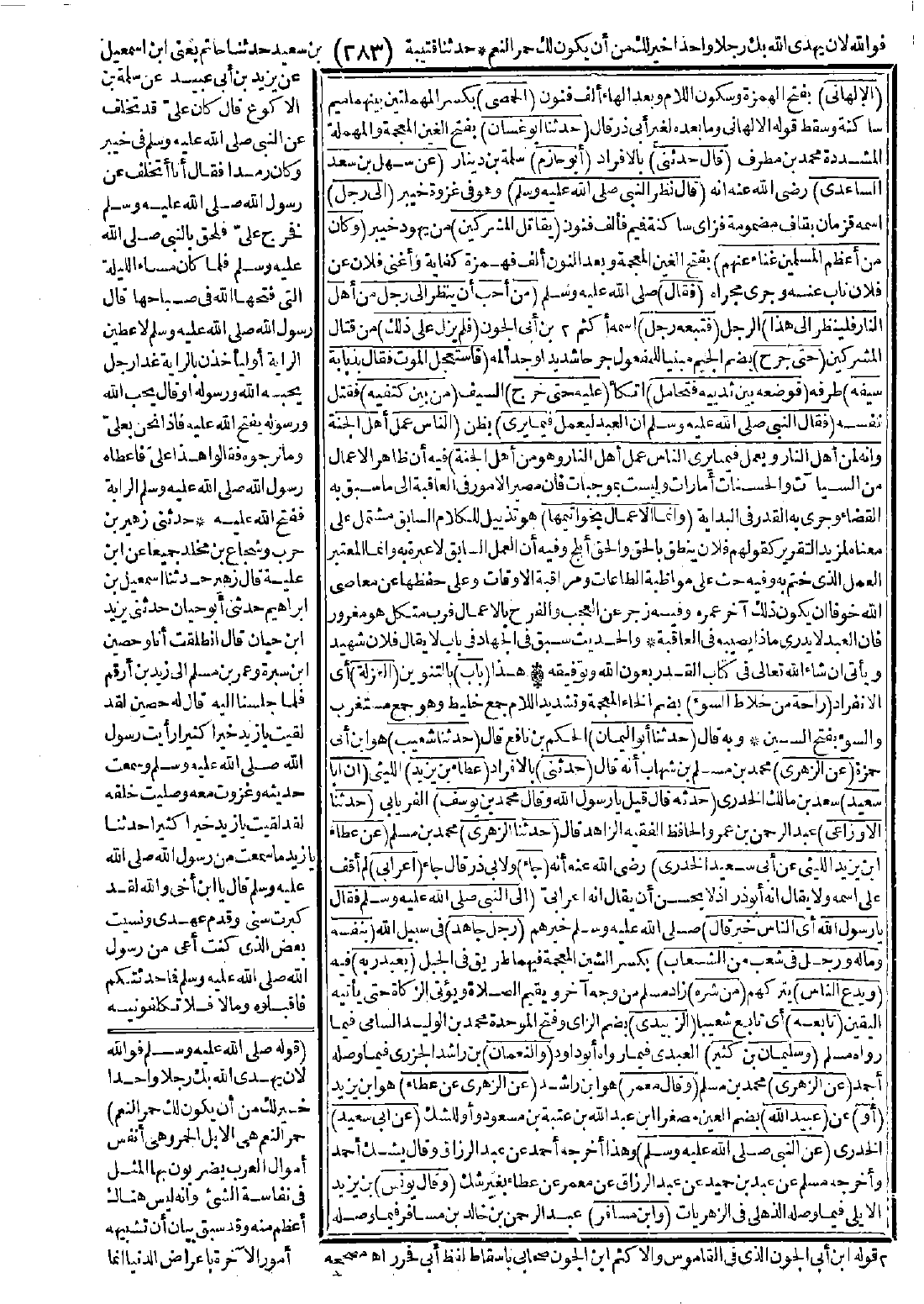 (الألهاني) بفتح الهمزة وسكون اللام وبعد الهاء ألف فنون (الحمصي) بكسر المهملتين بينهما ميم ساكنة وسقط قوله الألهاني وما بعده لغير أبي ذر قال: (حدّثنا أبو غسان) بفتح الغين المعجمة والمهملة المشددة محمد بن مطرف (قال: حدثني) بالإفراد (أبو حازم) سلمة بن دينار (عن سهل بن سعد الساعدي) -رضي الله عنه- أنه (قال: نظر النبي -صَلَّى اللَّهُ عَلَيْهِ وَسَلَّمَ-) وهو في غزوة خيبر (إلى رجل) اسمه قزمان بقاف مضمومة فزاي ساكنة فميم فألف فنون (يقاتل المشركين) من يهود خيبر (وكان من أعظم المسلمين غناء عنهم) بفتح الغين المعجمة وبعد النون ألف فهمزة كفاية وأغنى فلان عن فلان ناب عنه وجرى مجراه (فقال) -صَلَّى اللَّهُ عَلَيْهِ وَسَلَّمَ-: