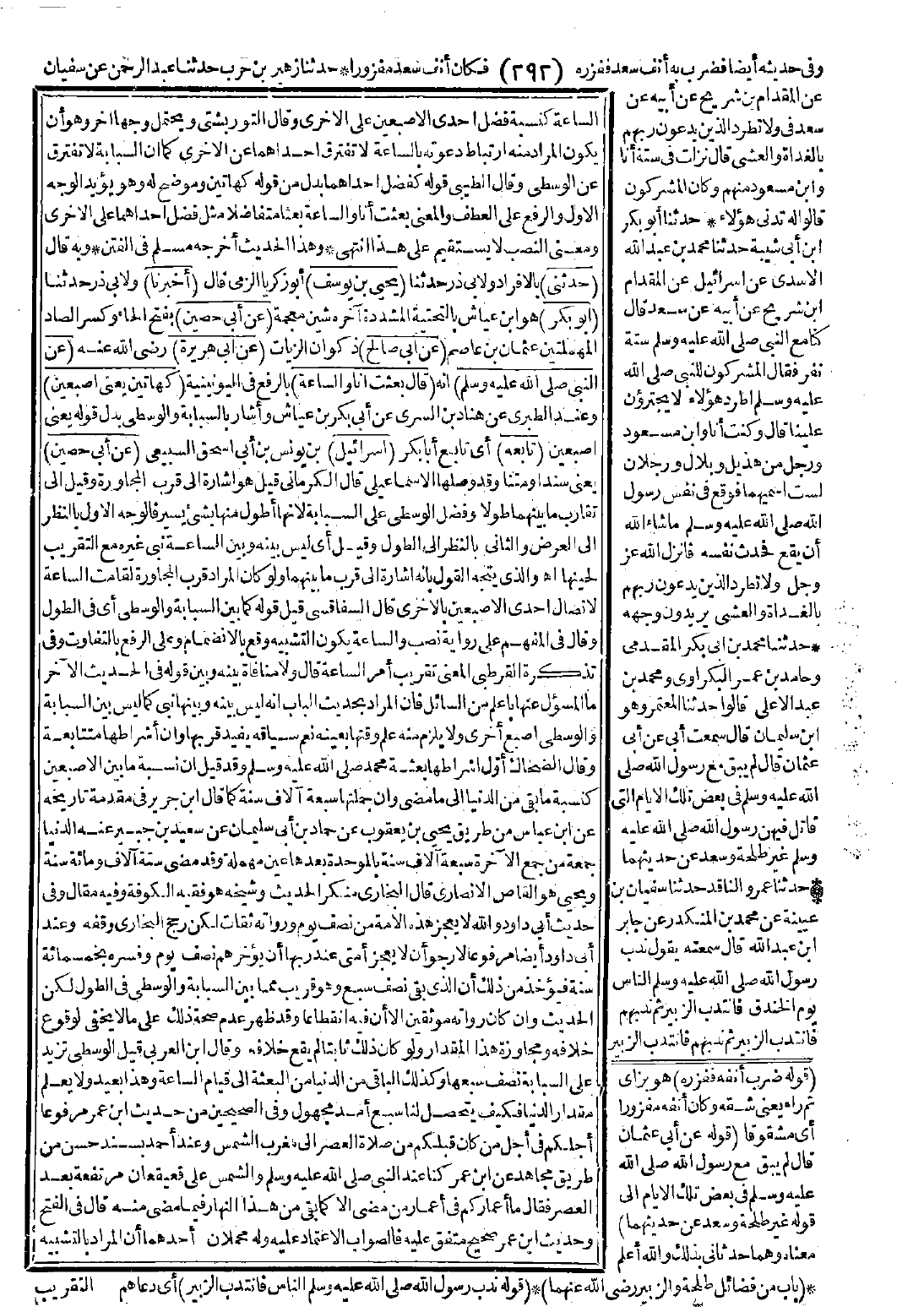 جبير عنه: الدنيا جمعة من جمع الآخرة سبعة آلاف سنة بالموحدة بعدها عين مهملة وقد مضى ستة آلاف ومائة سنة ويحيى هو القاضي الأنصاري. قال البخاري: منكر الحديث وشيخه هو فقيه الكوفة وفيه مقال، وفي حديث أبي داود: والله لا يعجز هذه الأمة من نصف يوم ورواته ثقات لكن رجح البخاري وقفه، وعند أبي داود أيضًا مرفوعًا لأرجو أن لا يعجز أمتي عند ربها أن يؤخرهم نصف يوم، وفسره بخمسمائة سنة، فيؤخذ من ذلك أن الذي بقي نصف سبع وهو قريب ما بين السبابة والوسطى في الطول، لكن الحديث وإن كان رواته موثقين إلا أن فيه انقطاعًا وقد ظهر عدم صحة ذلك على ما لا يخفى لوقوع خلافه ومجاوزة هذا المقدار ولو كان ذلك ثابتًا لم يقع خلافه. وقال ابن العربي: قيل الوسطى تزيد على السبابة نصف سبعها وكذلك الباقي من الدنيا من البعثة إلى قيام الساعة وهذا بعيد ولا يعلم مقدار الدنيا فكيف يتحصل لنا سبع أمد مجهول. وفي الصحيحين من حديث ابن عمر مرفوعًا: أجلكم في أجل من كان قبلكم من صلاة العصر إلى مغرب الشمس، وعند أحمد بسند حسن من طريق مجاهد عن ابن عمر كنا عند النبي -صَلَّى اللَّهُ عَلَيْهِ وَسَلَّمَ- والشمس على قعيقان مرتفعة بعد العصر فقال: "ما أعماركم في أعمار من مضى إلا كما بقي من هذا النهار فيما مضى منه".