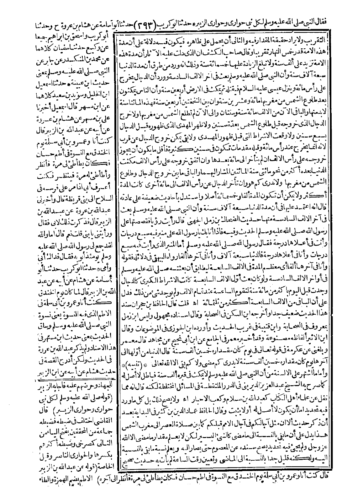 ولا يصح ذلك بل كل ما ورد فيه تحديد إما أن يكون لا أصل له أو لا يثبت. وقال الحافظ عماد الدين بن كثير في البداية بعد أن ذكر حديث: ألا أن مثل آجالكم في آجال الأمم قبلكم كما بين صلاة العصر إلى مغرب الشمس هذا يدل على أن ما بقي بالنسبة إلى ما مضى كالشيء اليسير لكن لا يعلم مقدار ما مضى إلا الله عز وجل ولم يجيء فيه تحديد يصح سنده عن المعصوم حتى يصار إليه ويعلم نسبة ما بقي بالنسبة إليه، ولكنه قليل جدًّا بالنسبة إلى الماضي، وتعيين وقت الساعة لم يأت به حديث صحيح