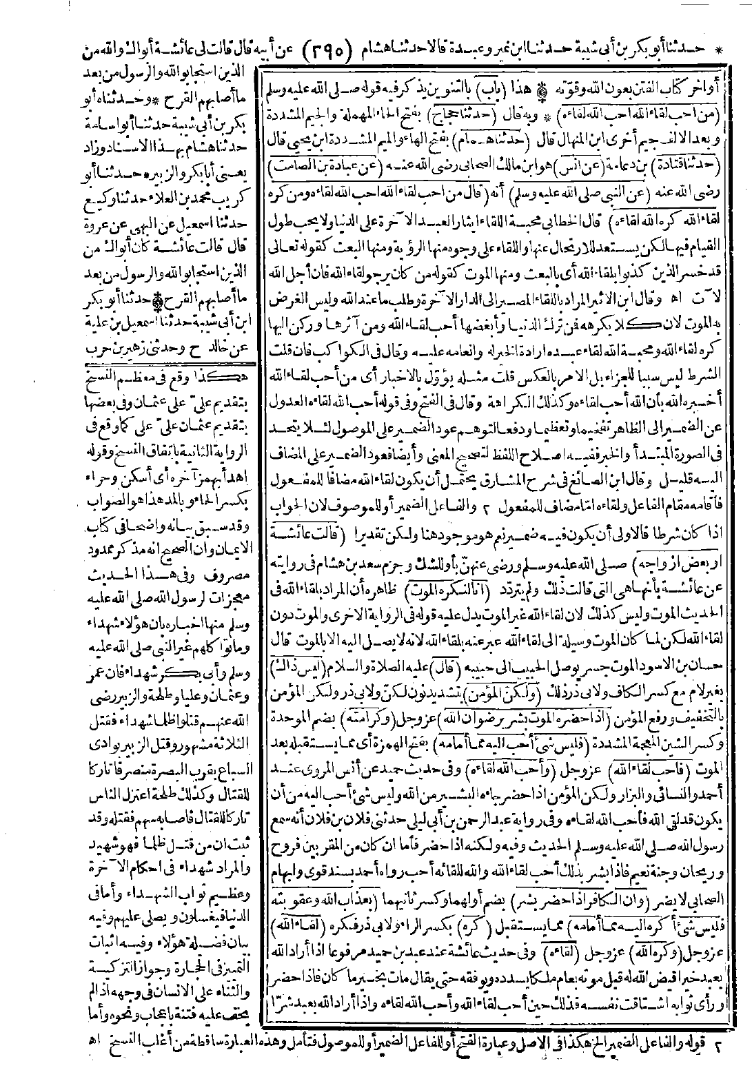 وقال ابن الأثير: المراد باللقاء المصير إلى الدار الآخرة وطلب ما عند الله وليس الغرض به الموت لأن كلاًّ يكرهه فمن ترك الدنيا وأبغضها أحب لقاء الله ومن آثرها وركن إليها كره لقاء الله ومحبة الله لقاء عبده إرادة الخير له وإنعامه عليه. وقال في الكواكب: فإن قلت: الشرط ليس سببًا للجزاء بل الأمر بالعكس، قلت: مثله يؤوّل بالإخبار أي من أحب لقاء الله أخبره الله بأن الله أحب لقاءه وكذلك الكراهة. وقال في الفتح: وفي قوله أحب الله لقاءه العدول عن الضمير إلى الظاهر تفخيمًا وتعظيمًا ودفعًا لتوهم عود الضمير على الموصول لئلا يتحد في الصورة المبتدأ والخبر ففيه إصلاح اللفظ لتصحيح المعنى، وأيضًا فعود الضمير على المضاف إليه قليل، وقال ابن الصائغ في شرح المشارق: يحتمل أن يكون لقاء الله مضافًا للمفعول فأقامه مقام الفاعل ولقاءه إما مضاف للمفعول والفاعل الضمير أو للموصوف لأن الجواب إذا كان شرطًا فالأولى أن يكون فيه ضمير نعم هو موجود هنا ولكن تقديرًا.