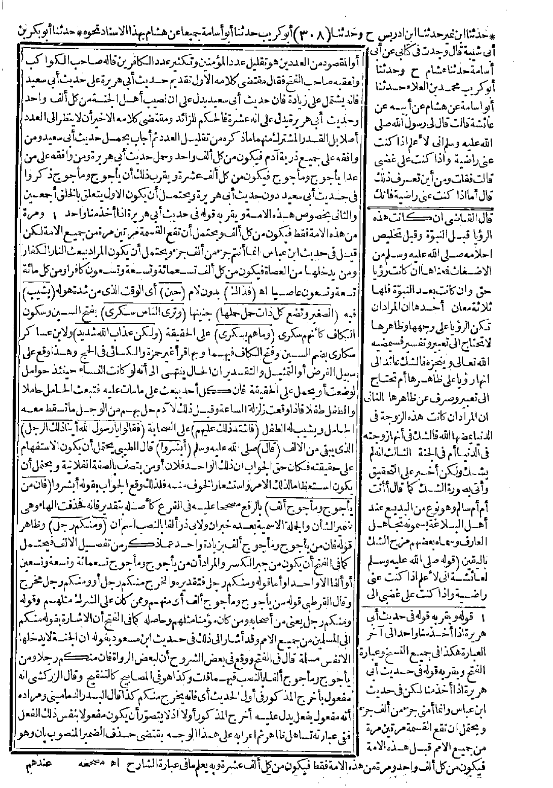 أو المقصود من العددين هو تقليل عدد المؤمنين وتكثير عدد الكافرين قاله صاحب الكواكب. وتعقبه صاحب الفتح فقال: مقتضى كلامه الأول تقديم حديث أبي هريرة على حديث أبي سعيد فإنه يشتمل على زيادة، فإن حديث أبي سعيد يدل على أن نصيب أهل الجنة من كل ألف واحد، وحديث أبي هريرة يدل على أنه عشرة فالحكم للزائد ومقتضى كلامه الأخير أن لا ينظر إلى العدد أصلاً بل القدر المشترك منهما ما ذكره من تقليل العدد، ثم أجاب بحمل حديث أبي سعيد ومن وافقه على جميع ذرية آدم فيكون من كل ألف واحد، وحمل حديث أبي هريرة ومن وافقه على من عدا يأجوج ومأجوج، فيكون من كل ألف عشرة ويقرب ذلك أن يأجوج ومأجوج ذكروا في حديث أبي سعيد دون حديث أبي هريرة، ويحتمل أن يكون الأول يتعلق بالخلق أجمعين، والثاني بخصوص هذه الأمة ويقربه قوله في حديث أبي هريرة: إذا أخذ منا واحد ومرة من هذه الأمة فقط فيكون من كل ألف، ويحتمل أن تقع القسمة مرتين مرة من جميع الأمة لكن قيل في حديث ابن عباس إنما أنتم جزء من ألف جزء ويحتمل أن يكون المراد ببعث النار الكفار ومن يدخلها من العصاة فيكون من كل ألف تسعمائة وتسعة وتسعون كافرًا ومن كل مائة تسعة وتسعون عاصيًا اهـ.