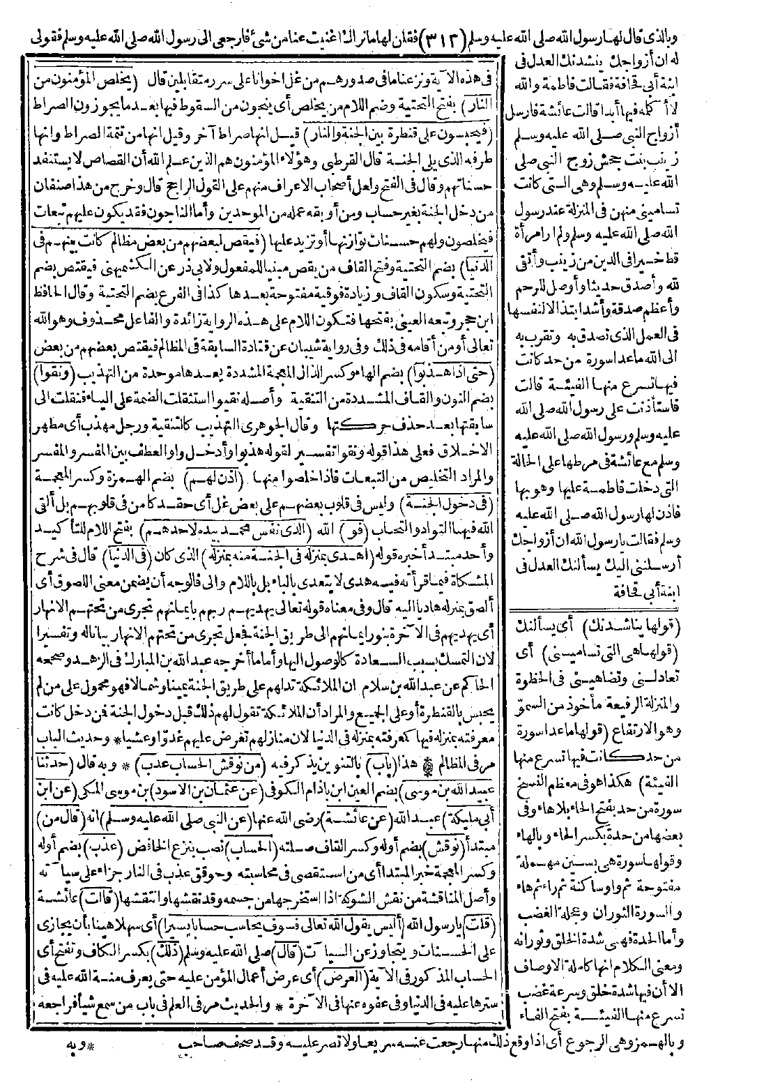 عَائِشَةَ عَنِ النَّبِيِّ -صَلَّى اللَّهُ عَلَيْهِ وَسَلَّمَ- قَالَ: «مَنْ نُوقِشَ الْحِسَابَ عُذِّبَ» قَالَتْ: قُلْتُ: أَلَيْسَ يَقُولُ اللَّهُ تَعَالَى: {فَسَوْفَ يُحَاسَبُ حِسَابًا يَسِيرًا} [الانشقاق: 8] قَالَ: «ذَلِكِ الْعَرْضُ».