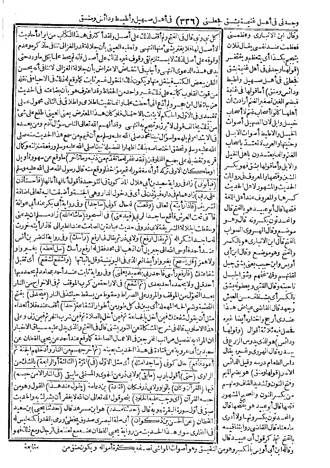 وقد ألهم الله تعالى الناس سؤال آدم ومن بعده في الابتداء ولم يلهموا سؤال نبينا محمد -صَلَّى اللَّهُ عَلَيْهِ وَسَلَّمَ- مع أن فيهم من سمع هذا الحديث منه -صَلَّى اللَّهُ عَلَيْهِ وَسَلَّمَ- وتحقق اختصاصه بذلك إظهارًا لفضيلة نبينا -صَلَّى اللَّهُ عَلَيْهِ وَسَلَّمَ- ورفعة منزلته وكمال قربه وتفضيله على جميع المخلوقين. (فقد غفر له ما تقدّم من ذنبه وما تأخر) ما وقع عن سهو وتأويل أو ما كان الأولى تركه أو أنه مغفور له غير مؤاخذ لو وقع منه. قال رسول الله -صَلَّى اللَّهُ عَلَيْهِ وَسَلَّمَ-: (فيأتوني) زاد في رواية سعيد بن أبي هلال المذكورة في التوحيد فأقول أنا لها أنا لها (فأستأذن على ربي) زاد همام في داره فيؤذن لي أي في دخول الدار وهي الجنة وأضيفت إليه تعالى إضافة تشريف (فإذا رأيته) تعالى (وقعت) له حال كوني (ساجدًا) وفي رواية أبي بكر عند أبي عوانة فآتي تحت العرش فأقع ساجدًا لربي (فيدعني) في السجود (ما شاء الله) زاد مسلم أن يدعني وسقطت الجلالة الشريفة لأبي ذر وفي حديث عبادة بن الصامت عند الطبراني فإذا رأيته خررت له ساجدًا شكرًا له (ثم يقال ارفع) ولأبي ذر ثم يقال لي ارفع (رأسك) وفي رواية النضر بن أنس عند أحمد فأوحى الله إلى جبريل أن اذهب إلى محمد فقل له ارفع رأسك (سل تعطه) بغير واو ولا همز (قل يسمع) بغير واو أيضًا نعم في اليونينية وقل بإثباتها (واشفع تشفع) أي تقبل شفاعتك (فأرفع رأسي فأحمد رب بتحميد يعلمني) وفي رواية ثابت عند أحمد بمحامد لم يحمده بها أحد قبلي ولا يحمده أحد بعدي (ثم اشفع) في الإراحة من كرب الموقف ثم في الإخراج من النار بعد التحوّل من الموقف والمرور على الصراط وسقوط من يسقط حينئذ في النار (فيحدّ لي) بفتح التحتية وضم الحاء المهملة أي يبين لي كل طور من أطوار الشفاعة (حدًّا) أقف عنده فلا أتعداه مثل أن يقول شفعتك فيمن أخلّ بالجماعة ثم فيمن أخلّ بالصلاة ثم فيمن شرب الخمر ثم فيمن زنى وعلى هذا الأسلوب قاله في شرح المشكاة عن التوربشتي. قال في الفتح: والذي يدل عليه سياق الأخبار أن المراد به تفصيل مراتب المخرجين في الأعمال الصالحة كما وقع عند أحمد عن يحيى القطان عن سعيد بن أبي عروبة عن قتادة في هذا الحديث بعينه (ثم أخرجهم من النار وأدخلهم الجنة ثم أعود فأقع) حال كوني (ساجدًا مثله) أي مثل الأول (في) المرة (الثالثة أو الرابعة) بالشك من الراوي (حتى) أقول يا رب (ما بقي) ولأبي ذر عن الحموي والمستملي ما يبقى (في النار إلا من حبسه) فيها (القرآن وكان) بالواو
