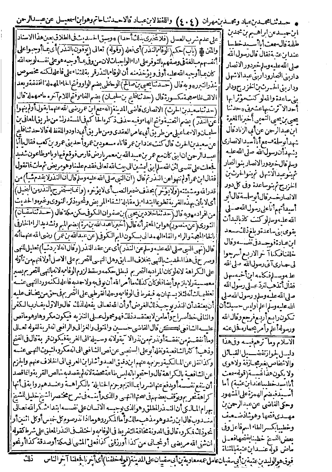 وبه قال: (حدّثنا يحيى بن صالح) الوحاظي بضم الواو وفتح الحاء المهملة المخففة وبعد الألف ظاء معجمة مكسورة قال: (حدّثنا فليح بن سليمان) بضم الفاء وفتح اللام آخره حاء مهملة قال (حدّثنا سعيد بن الحارث) الأنصاري قاضي المدينة (أنه سمع ابن عمر -رضي الله عنهما- يقول: أو لم ينهوا عن النذر) بضم التحتية وفتح الهاء وفيه حذف ذكره الحاكم في المستدرك من طريق المعافى بن سليمان، والإسماعيلي من طريق أبي عامر العقدي ومن طريق أبي داود واللفظ له قالا: حدّثنا فليح عن سعيد بن الحارث قال: كنت عند ابن عمر فأتاه مسعود بن عمرو أحد بني عمرو بن كعب فقال: يا أبا عبد الرَّحمن إن ابني كان مع عمر بن عبيد الله بن معمر بأرض فارس فوقع فيها وباء وطاعون شديد فجعلت على نفسي لئن الله سلم ابني ليمشين إلى بيت الله تعالى فقدم علينا وهو مريض ثم مات فما تقول؟ فقال ابن عمر: أو لم تنهوا عن النذر ثم قال: (إن النبي -صَلَّى اللَّهُ عَلَيْهِ وَسَلَّمَ- قال):
