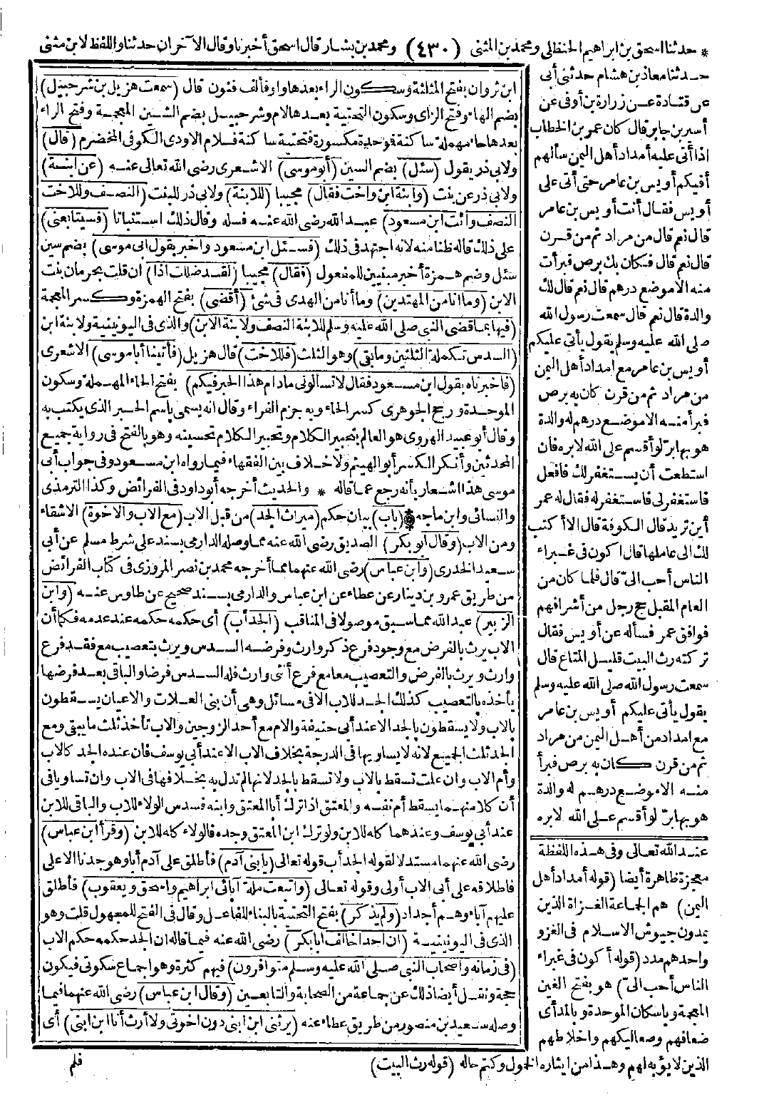 بن ثروان بفتح المثلثة وسكون الراء بعدها واو فألف فنون قال: (سمعت هزيل بن شرحبيل) بضم الهاء وفتح الزاي وسكون التحتية بعدها لام وشرحبيل بضم الشين المعجمة وفتح الراء بعدها حاء مهملة ساكنة فموحدة مكسورة فتحتية ساكنة فلام الأودي الكوفي المخضرم (قال): ولأبي ذر يقول (سئل) بضم السين (أبو موسى) الأشعري رضي الله تعالى عنه (عن ابنة) ولأبي ذر عن بنت (وابنة ابن وأخت فقال) مجيبًا: (للابنة) ولأبي ذر للبنت (النصف، وللأخت النصف، وائت ابن مسعود) عبد الله -رضي الله عنه- فسله وقال ذلك استثباتًا (فسيتابعني) على ذلك قاله ظنًّا منه لأنه اجتهد في ذلك (فسئل ابن مسعود وأخبر بقول أبي موسى) بضم سين سئل وضم همزة أخبر مبنيين للمفعول (فقال) مجيبًا: (لقد ضللت إذًا) إن قلت بحرمان بنت الابن (وما أنا من المهتدين) وما أنا من الهدى في شيء (أقضي) بفتح الهمزة وكسر المعجمة (فيها بما قضى النبي -صَلَّى اللَّهُ عَلَيْهِ وَسَلَّمَ- للابنة النصف ولابنة الابن) والذي في اليونينية ولابنة ابن (السدس تكملة الثلثين وما بقي) وهو الثلث (فللأخت) قال هزيل: (فأتينا أبا موسى) الأشعري (فأخبرناه بقول ابن مسعود فقال: لا تسألوني ما دام هذا الحبر فيكم) بفتح الحاء المهملة وسكون الموحدة ورجح الجوهري كسر الحاء وبه جزم الفراء وقال: إنه يسمى باسم الحبر الذي يكتب به. وقال أبو عبيد الهروي: هو العالم بتحبير الكلام وتحبير الكلام تحسينه وهو بالفتح في رواية جمع المحدثين وأنكر الكسر أبو الهيثم ولا خلاف بين الفقهاء فيما رواه ابن مسعود، وفي جواب أبي موسى هذا إشعار بأنه رجع عما قاله.