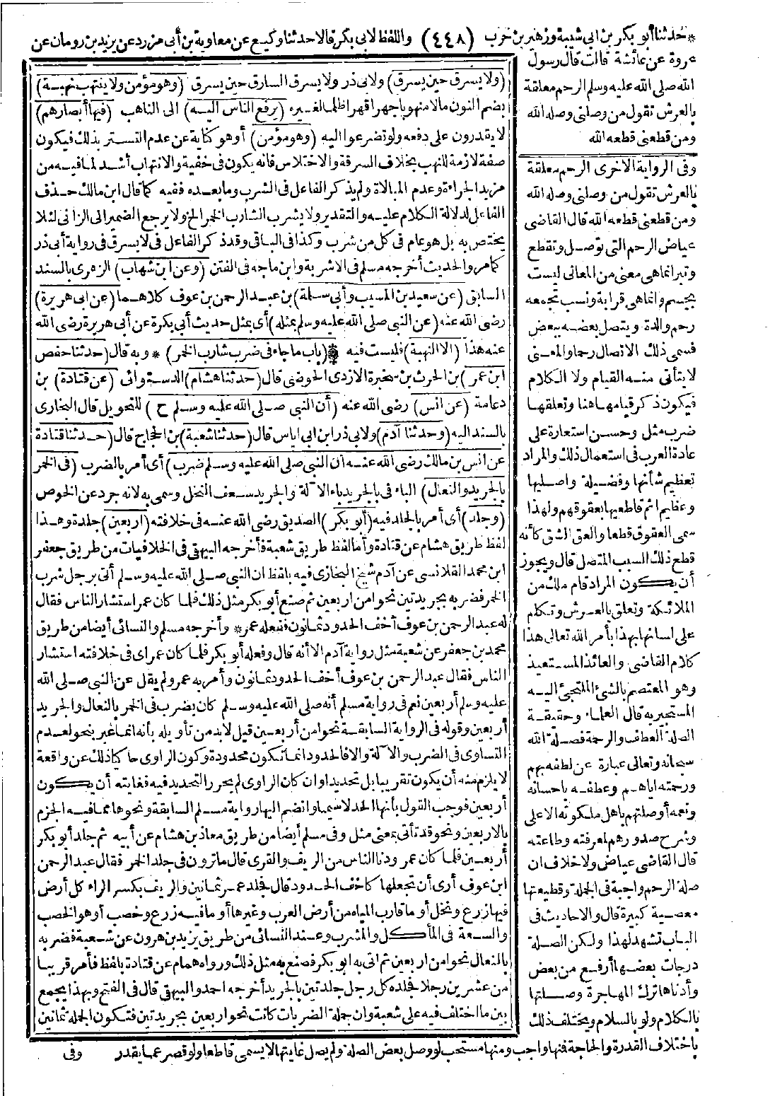 قال البخاري بالسند إليه: (وحدّثنا آدم) ولأبي ذر: ابن أبي إياس قال: (حدّثنا شعبة) بن الحجاج قال: (حدّثنا قتادة عن أنس بن مالك -رضي الله عنه- أن النبي -صَلَّى اللَّهُ عَلَيْهِ وَسَلَّمَ- ضرب) أي أمر بالضرب (في الخمر بالجريد والنعال) الباء في بالجريد باء الآلة والجريد سعف النخل وسمي به لأنه جرد عن الخوص (وجلد) أي أمر بالجلد فيه (أبو بكر) الصديق -رضي الله عنه- في خلافته (أربعين) جلدة، وهذا لفظ طريق هشام عن قتادة وأما لفظ طريق شعبة فأخرجه البيهقي في الخلافيات من طريق جعفر بن محمد القلانسي عن آدم شيخ البخاري فيه بلفظ: إن النبي -صَلَّى اللَّهُ عَلَيْهِ وَسَلَّمَ- أتي برجل شرب الخمر فضربه بجريدتين نحوًا من أربعين، ثم صنع أبو بكر مثل ذلك فلما كان عمر استشار الناس فقال له عبد الرَّحمن بن عوف: أخف الحدود ثمانون ففعله عمر.