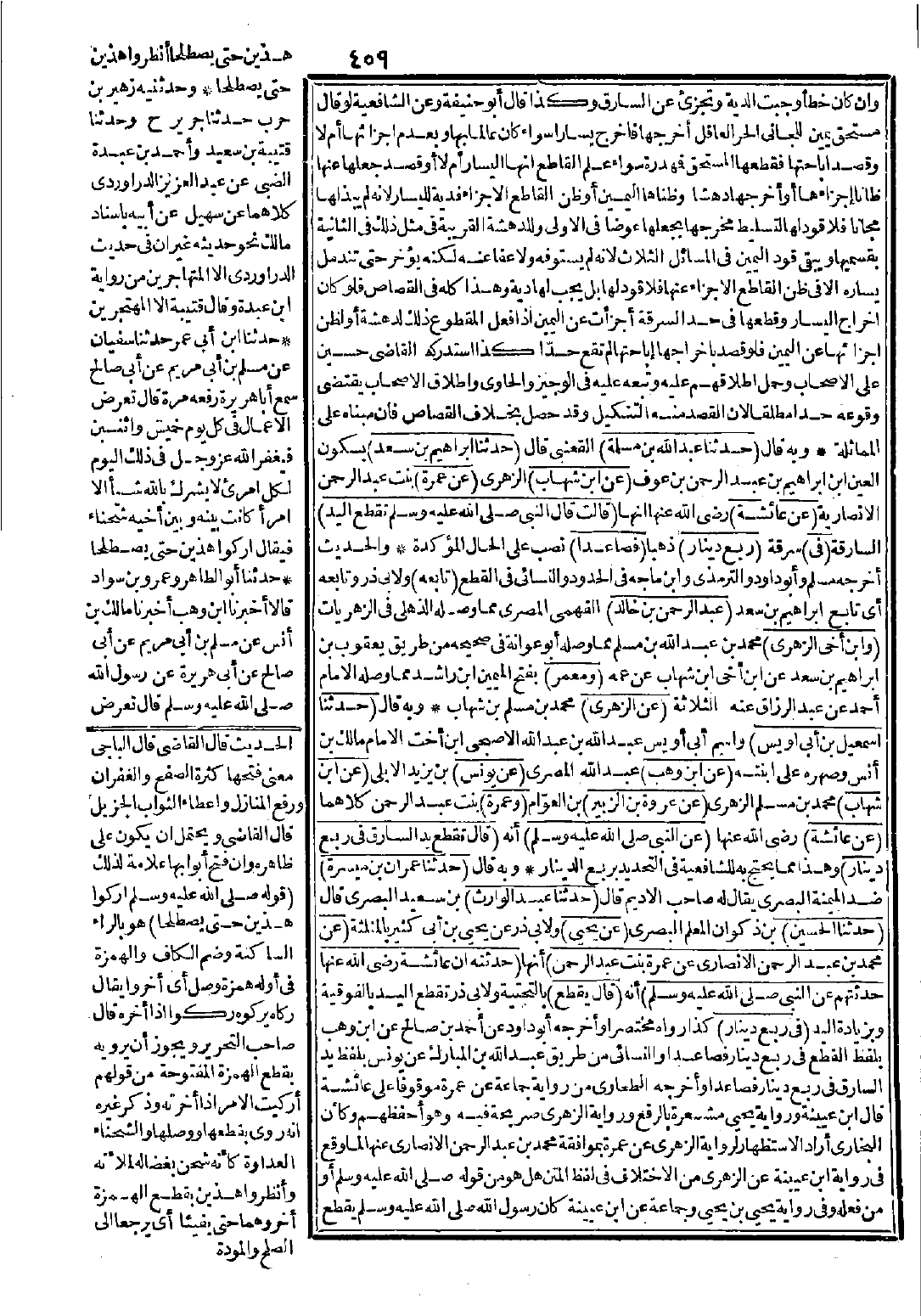 6789 - حَدَّثَنَا عَبْدُ اللَّهِ بْنُ مَسْلَمَةَ، حَدَّثَنَا إِبْرَاهِيمُ بْنُ سَعْدٍ، عَنِ ابْنِ شِهَابٍ، عَنْ عَمْرَةَ، عَنْ عَائِشَةَ قَالَتْ: قَالَ النَّبِىُّ -صَلَّى اللَّهُ عَلَيْهِ وَسَلَّمَ-: «تُقْطَعُ الْيَدُ فِى رُبُعِ دِينَارٍ فَصَاعِدًا». تَابَعَهُ عَبْدُ الرَّحْمَنِ بْنُ خَالِدٍ وَابْنُ أَخِى الزُّهْرِىِّ وَمَعْمَرٌ عَنِ الزُّهْرِىِّ. [الحديث 6789 - طرفاه في: 6790، 6791].