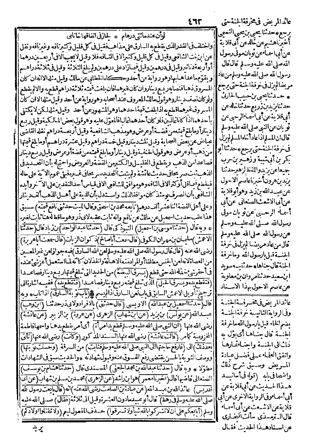 واختلف في القدر الذي يقطع به السارق على مذاهب، فقيل في كل قليل وكثير تافه وغير تافه ونقل عن ابن بنت الشافعي، وقيل في كل قليل وكثير إلا في التافه فلا وقيل لا يجب إلا في أربعين درهمًا أو أربعة دنانير، وقيل في درهمين وقيل فيما زاد على درهمين ولم يبلغ الثلاثة، وقيل في ثلاثة دراهم ويقوّم ما عداها بها وهو رواية عن أحمد، وحكاه الخطابي عن مالك، وقيل مثله إلا أنه إن كان المسروق ذهبًا فنصابه ربع دينار وإن كان غيرهما فإن بلغت قيمته ثلاثة دراهم قطع به إلا لم يقطع ولو كان نصف دينار وهو قول مالك المعروف عند أصحابه وهو رواية عن أحمد، وقيل مثله إلا إن كان المسروق غيرهما قطع به إذا بلغت قيمة أحدهما وهو المشهور عن أحمد. وقيل مثله لكن لا يكتفى بأحدهما إذا كانا غالبين فلو كان أحدهما غالبًا فالمعوّل عليه وهو قول بعض المالكية، وقيل ربع دينار أو ما بلغ قيمته من فضة أو عرض وهو مذهب الشافعية، وقيل أربعة دراهم نقله القاضي عياض عن بعض الصحابة، وقيل ثلث دينار، وقيل خمسة دراهم وقيل عشرة دراهم أو ما بلغ قيمتها من ذهب أو عرض وهو قول الحنفية، وقيل دينار أو ما بلغ