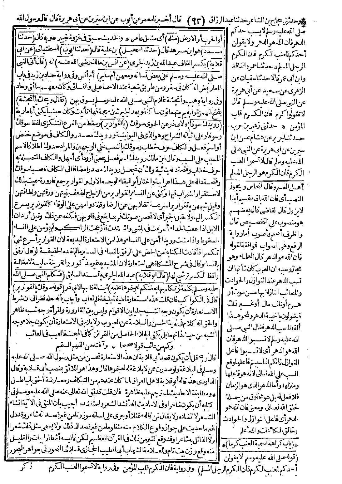 (قال أبو قلابة): عبد الله الجرمي بالسند السابق (فتكلم النبي -صَلَّى اللَّهُ عَلَيْهِ وَسَلَّمَ- بكلمة لو تكلم بها بعضكم لعبتموها عليه) ثبت لفظ بها لأبي ذر (قوله سوقك بالقوارير).