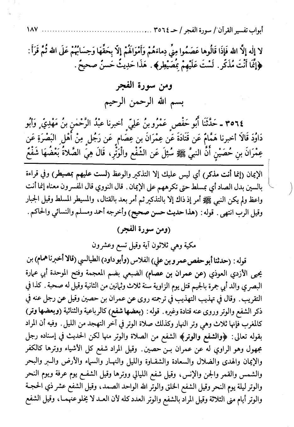 8 - بَاب وَمِنْ سُورَةِ الْفَجْرِ مَكِّيَّةٌ وَهِيَ ثَلَاثُونَ آيَةً وَقِيلَ تِسْعٌ وَعِشْرُونَ [3342] قَوْلُهُ (حَدَّثَنَا أَبُو حَفْصٍ عَمْرُو بْنُ عَلِيٍّ) الْفَلَّاسُ (وَأَبُو دَاوُدَ) الطَّيَالِسِيُّ (قَالَا أَخْبَرَنَا هَمَّامُ) بن يحي الْأَزْدِيُّ الْعَوْذِيُّ (عَنْ عِمْرَانَ بْنِ عِصَامٍ) الضُّبَعِيِّ بِضَمِّ الْمُعْجَمَةِ وَفَتْحِ الْمُوَحَّدَةِ أَبِي عُمَارَةَ الْبَصْرِيِّ وَالِدِ أَبِي جَمْرَةَ بِالْجِيمِ قُتِلَ يَوْمَ الزَّاوِيَةِ سَنَةَ ثَلَاثٍ وَثَمَانِينَ مِنَ الثَّانِيَةِ وَقِيلَ لَهُ صُحْبَةً