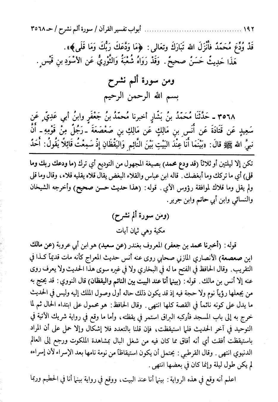 2 - باب وَمِنْ سُورَةِ أَلَمْ نَشْرَحْ مَكِّيَّةٌ وَهِيَ ثَمَانِ آيَاتٍ [3346] قَوْلُهُ (أَخْبَرَنَا مُحَمَّدُ بْنُ جَعْفَرٍ) الْمَعْرُوفُ بِغُنْدَرٍ (عن سعيد) هو بن أَبِي عَرُوبَةَ (عَنْ مَالِكِ بْنِ صَعْصَعَةَ) الْأَنْصَارِيِّ الْمَازِنِيِّ صَحَابِيٌّ رَوَى عَنْهُ أَنَسٌ حَدِيثَ الْمِعْرَاجِ كَأَنَّهُ مَاتَ قَدِيمًا كَذَا فِي التَّقْرِيبِ