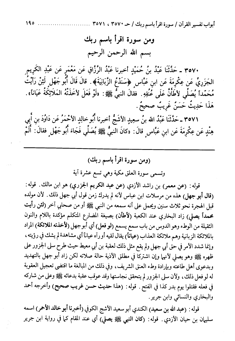 [3348] قَوْلُهُ عَنْ مَعْمَرِ بْنِ رَاشِدٍ الْأَزْدِيِّ عَنْ عَبْدِ الكريم الجزري هو بن مَالِكٍ قَوْلُهُ قَالَ أَبُو جَهْلٍ هَذِهِ مِنْ مرسلات بن عَبَّاسٍ لِأَنَّهُ لَمْ يُدْرِكْ زَمَنَ قَوْلِ أَبِي جَهْلٍ ذَلِكَ لِأَنَّ مَوْلِدَهُ قَبْلَ الْهِجْرَةِ نَحْوَ ثَلَاثِ سِنِينَ وَيُحْمَلُ عَلَى أَنَّهُ سَمِعَهُ مِنَ النَّبِيِّ صَلَّى اللَّهُ عَلَيْهِ وَسَلَّمَ أَوْ مِنْ صَحَابِيٍّ آخَرَ لَئِنْ رَأَيْتُ مُحَمَّدًا يُصَلِّي زَادَ الْبُخَارِيُّ عِنْدَ الْكَعْبَةِ لَأَطَأَنَّ بِصِيغَةِ الْمُضَارِعِ الْمُتَكَلِّمِ مُؤَكَّدَةً بِاللَّامِ وَالنُّونِ الثَّقِيلَةِ مِنَ الْوَطْءِ وَهُوَ الدَّوْسُ مِنْ بَابِ سَمِعَ يَسْمَعُ لَوْ فَعَلَ أَيْ أَبُو جَهْلٍ لَأَخَذَتْهُ الْمَلَائِكَةُ الْمُرَادُ بِالْمَلَائِكَةِ الزَّبَانِيَةُ وَهُمْ مَلَائِكَةُ الْعَذَابِ عِيَانًا يُقَالُ لَقِيَهُ أَوْ رَآهُ عِيَانًا أَيْ مُشَاهَدَةً لَمْ يَشُكَّ فِي رُؤْيَتِهِ وَإِنَّمَا شَدَّدَ الْأَمْرَ فِي حَقِّ أَبِي جَهْلٍ وَلَمْ يَقَعْ مِثْلُ ذَلِكَ لِعُقْبَةَ بْنِ أَبِي مُعَيْطٍ حَيْثُ طَرَحَ سَلَى الْجَزُورِ عَلَى ظَهْرِهِ صَلَّى اللَّهُ عَلَيْهِ وَسَلَّمَ وَهُوَ يُصَلِّي لِأَنَّهُمَا وَإِنِ اشْتَرَكَا فِي مُطْلَقِ الْأَذِيَّةِ حَالَةَ صَلَاتِهِ لَكِنْ زَادَ أَبُو جَهْلٍ بِالتَّهْدِيدِ وَبِدَعْوَى أَهْلِ طَاعَتِهِ وَبِإِرَادَةِ وَطْءِ الْعُنُقِ الشَّرِيفِ وَفِي ذَلِكَ مِنَ الْمُبَالَغَةِ مَا اقْتَضَى تَعْجِيلَ الْعُقُوبَةِ لَهُ لَوْ فَعَلَ ذَلِكَ وَلِأَنَّ سَلَى الْجَزُورِ لَمْ يَتَحَقَّقْ نَجَاسَتُهَا وَقَدْ عُوقِبَ عُقْبَةُ بِدُعَائِهِ صَلَّى اللَّهُ عَلَيْهِ وَسَلَّمَ وَعَلَى مَنْ شَارَكَهُ فِي فِعْلِهِ فَقُتِلُوا يَوْمَ بَدْرٍ كَذَا فِي الْفَتْحِ قَوْلُهُ هَذَا حَدِيثٌ حَسَنٌ غَرِيبٌ صَحِيحٌ وَأَخْرَجَهُ أحمد والبخاري والنسائي وبن جَرِيرٍ