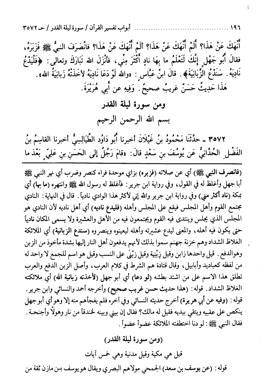 فَانْصَرَفَ النَّبِيُّ صَلَّى اللَّهُ عَلَيْهِ وَسَلَّمَ أَيْ عَنْ صَلَاتِهِ فَزَبَرَهُ بِزَايٍ مُوَحَّدَةٍ فَرَاءٍ كَنَصَرَ وَضَرَبَ أَيْ نَهَرَ النَّبِيُّ صَلَّى اللَّهُ عَلَيْهِ وَسَلَّمَ أَبَا جَهْلٍ وَأَغْلَظَ لَهُ فِي الْقَوْلِ وفي رواية بن جَرِيرٍ فَأَغْلَظَ لَهُ رَسُولُ اللَّهِ صَلَّى اللَّهُ عَلَيْهِ وَسَلَّمَ وَانْتَهَرَهُ مَا بِهَا أَيْ بِمَكَّةَ ناد أكثر مني وفي رواية بن جَرِيرٍ وَاللَّهِ إِنِّي لَأَكْثَرُ هَذَا الْوَادِي نَادِيًا قَالَ فِي النِّهَايَةِ النَّادِي مُجْتَمَعُ الْقَوْمِ وَأَهْلُ الْمَجْلِسِ فَيَقَعُ عَلَى الْمَجْلِسِ وَأَهْلِهِ فَلْيَدْعُ نَادِيَهُ أي أهل ناديه لأن النادي هو الْمَجْلِسِ الَّذِي يَجْلِسُ وَيَنْتَدِي فِيهِ الْقَوْمُ وَيَجْتَمِعُونَ فِيهِ مِنَ الْأَهْلِ وَالْعَشِيرَةِ وَلَا يُسَمَّى الْمَكَانُ نَادِيًا حَتَّى يَكُونَ فِيهِ أَهْلُهُ وَالْمَعْنَى لِيَدْعُ عشيرته وأهله ليعينوه وينصروه سندع الزبانية أَيِ الْمَلَائِكَةَ الْغِلَاظَ الشِّدَادَ وَهُمْ خَزَنَةُ جَهَنَّمَ سُمُّوا بِذَلِكَ لِأَنَّهُمْ يَدْفَعُونَ أَهْلَ النَّارِ إِلَيْهَا بِشِدَّةٍ مَأْخُوذٌ مِنَ الزَّبْنِ وَهُوَ الدَّفْعُ قِيلَ وَاحِدُهَا زَابِنٌ وَقِيلَ زِبْنِيَةٌ وَقِيلَ زِبْنِيٌّ عَلَى النَّسَبِ وَقِيلَ هُوَ اسْمٌ لِلْجَمْعِ لَا وَاحِدَ لَهُ مِنْ لَفْظِهِ كَعَبَادِيدَ وَأَبَابِيلَ وَقَالَ قَتَادَةُ هُمُ الشُّرَطُ فِي كَلَامِ الْعَرَبِ وَأَصْلُ الزَّبْنِ الدَّفْعُ وَالْعَرَبُ تُطْلِقُ هَذَا الِاسْمَ عَلَى مَنِ اشْتَدَّ بَطْشُهُ لَوْ دَعَا أَيْ أَبُو جَهْلٍ لَأَخَذَتْهُ زَبَانِيَةُ اللَّهِ أَيْ مَلَائِكَتُهُ الْغِلَاظُ الشِّدَادُ قَوْلُهُ هَذَا حَدِيثٌ حَسَنٌ غَرِيبٌ صَحِيحٌ وَأَخْرَجَهُ أحمد والنسائي وبن جَرِيرٍ قَوْلُهُ وَفِيهِ عَنْ أَبِي هُرَيْرَةَ أَخْرَجَ حديثه النسائي وفي آخره فلم يفجأهم مِنْهُ إِلَّا وَهُوَ أَيْ أَبُو جَهْلٍ يَنْكُصُ على عقبيه ويتقي بيديه فقيل له مالك فَقَالَ إِنَّ بَيْنِي وَبَيْنَهُ لَخَنْدَقًا مِنْ نَارٍ وَهَوْلًا وَأَجْنِحَةً فَقَالَ النَّبِيُّ صَلَّى اللَّهُ عَلَيْهِ وَسَلَّمَ لَوْ دَنَا اخْتَطَفَتْهُ الْمَلَائِكَةُ عُضْوًا عُضْوًا