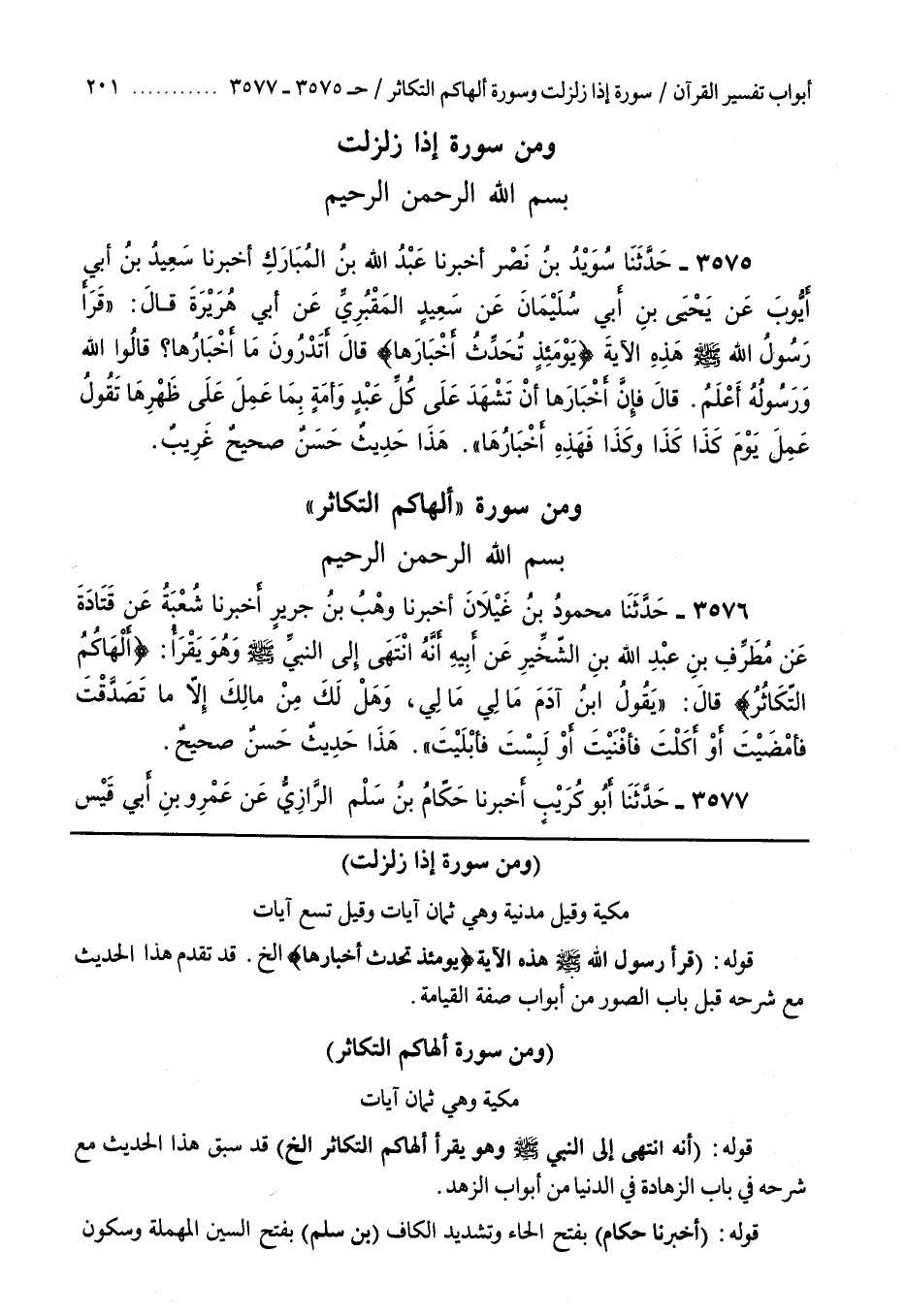 8 - باب ومن سورة ألهاكم التكاثر مَكِّيَّةٌ وَهِيَ ثَمَانِ آيَاتٍ [3354] قَوْلُهُ (أَنَّهُ انْتَهَى إِلَى النَّبِيِّ صَلَّى اللَّهُ عَلَيْهِ وَسَلَّمَ وَهُوَ يقرأ ألهاكم التكاثر إِلَخْ) قَدْ سَبَقَ هَذَا الْحَدِيثُ مَعَ شَرْحِهِ فِي بَابِ الزَّهَادَةِ فِي الدُّنْيَا مِنْ أَبْوَابِ الزُّهْدِ [3355] قَوْلُهُ (أَخْبَرَنَا حَكَّامٌ) بِفَتْحِ الْحَاءِ وَتَشْدِيدِ الْكَافِ (بْنُ سَلْمٍ) بِفَتْحِ السِّينِ الْمُهْمَلَةِ وَسُكُونِ اللَّامِ عَنْ عَمْرِو بْنِ أَبِي قَيْسٍ الرَّازَيِّ عَنِ الْحَجَّاجِ بْنِ أَرْطَاةَ) بِفَتْحِ الْهَمْزَةِ (عَنِ الْمِنْهَالِ بْنِ عَمْرٍو) الْأَسَدِيِّ