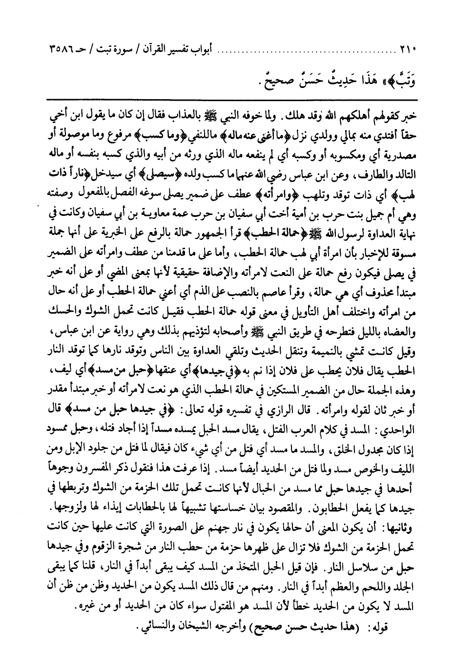 إِذَا عَرَفْتَ هَذَا فَنَقُولُ ذَكَرَ الْمُفَسِّرُونَ وُجُوهًا أَحَدُهَا فِي جِيدِهَا حَبْلٌ مِمَّا مُسِدَ مِنَ الْحِبَالِ لِأَنَّهَا كَانَتْ تَحْمِلُ تِلْكَ الْحُزْمَةَ مِنَ الشَّوْكِ وَتَرْبِطُهَا فِي جِيدِهَا كَمَا يَفْعَلُ الْحَطَّابُونَ