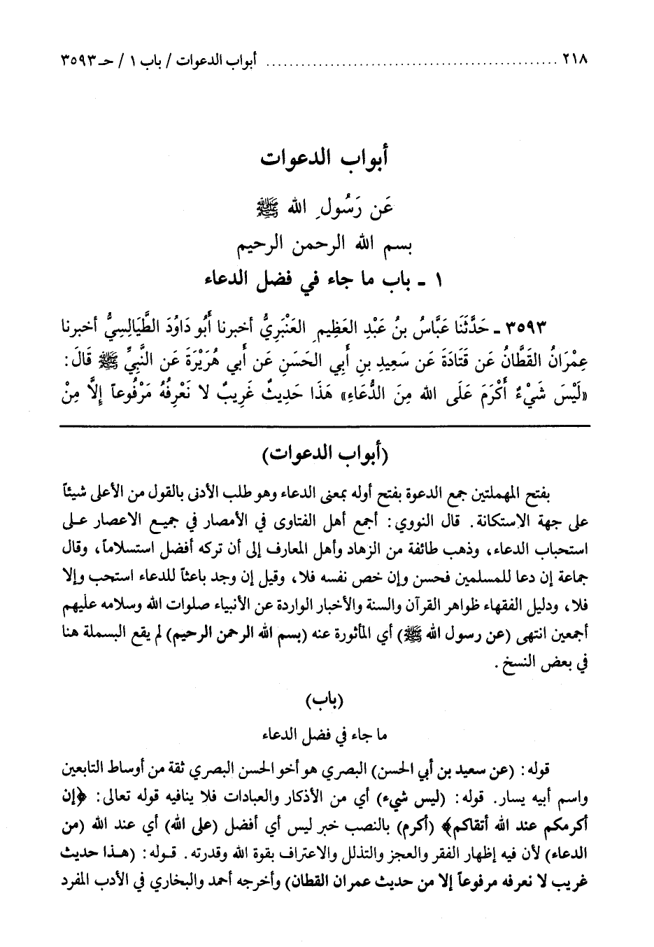 قَالَ النَّوَوِيُّ أَجْمَعَ أَهْلُ الْفَتَاوَى فِي الْأَمْصَارِ فِي جَمِيعِ الْأَعْصَارِ عَلَى اسْتِحْبَابِ الدُّعَاءِ وَذَهَبَ طَائِفَةٌ مِنَ الزُّهَّادِ وَأَهْلِ الْمَعَارِفِ إِلَى أَنَّ تَرْكَهُ أَفْضَلُ اسْتِسْلَامًا وَقَالَ جَمَاعَةٌ إِنْ دَعَا لِلْمُسْلِمِينَ فَحَسَنٌ وَإِنْ خَصَّ نَفْسَهُ فَلَا وَقِيلَ إِنْ وَجَدَ بَاعِثًا للدعاء استجب وَإِلَّا فَلَا وَدَلِيلُ الْفُقَهَاءِ ظَوَاهِرُ الْقُرْآنِ وَالسُّنَّةِ وَالْأَخْبَارُ الْوَارِدَةُ عَنِ الْأَنْبِيَاءِ صَلَوَاتُ اللَّهِ وَسَلَامُهُ عَلَيْهِمْ أَجْمَعِينَ انْتَهَى (عَنْ رَسُولِ اللَّهِ صَلَّى اللَّهُ عَلَيْهِ وَسَلَّمَ) أَيِ الْمَأْثُورَةِ عَنْهُ (بِسْمِ اللَّهِ الرَّحْمَنِ الرَّحِيمِ) لَمْ يَقَعِ الْبَسْمَلَةُ هُنَا في بعض النسخ