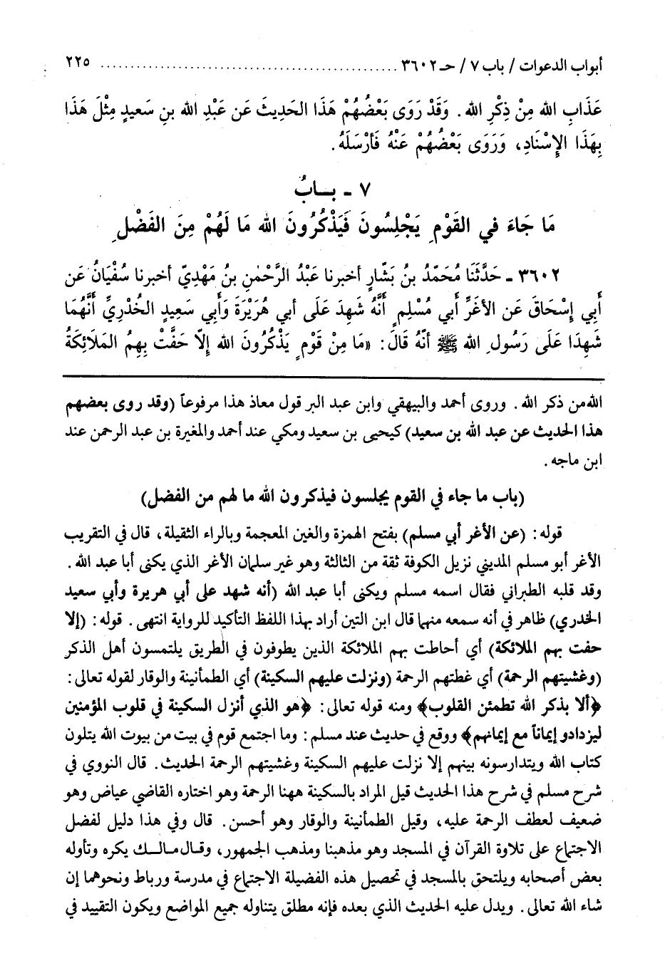 قَوْلُهُ إِلَّا حَفَّتْ بِهِمُ الْمَلَائِكَةُ أَيْ أَحَاطَتْ بِهِمُ الْمَلَائِكَةُ الَّذِينَ يَطُوفُونَ فِي الطَّرِيقِ يَلْتَمِسُونَ أَهْلَ الذِّكْرِ وَغَشِيَتْهُمُ الرَّحْمَةُ أَيْ غَطَّتْهُمُ الرَّحْمَةُ وَنَزَلَتْ عَلَيْهِمُ السَّكِينَةُ أَيِ الطُّمَأْنِينَةُ وَالْوَقَارُ لِقَوْلِهِ تعالى ألا بذكر الله تطمئن القلوب وَمِنْهُ قَوْلهُ تَعَالَى هُوَ الَّذِي أَنْزَلَ السَّكِينَةَ فِي قُلُوبِ الْمُؤْمِنِينَ لِيَزْدَادُوا إِيمَانًا مَعَ إِيمَانِهِمْ وَوَقَعَ فِي حَدِيثٍ عِنْدَ مُسْلِمٍ وَمَا اجْتَمَعَ قَوْمٌ فِي بَيْتٍ مِنْ بُيُوتِ اللَّهِ يَتْلُونَ كِتَابَ اللَّهِ وَيَتَدَارَسُونَهُ بَيْنَهُمْ إِلَّا نَزَلَتْ عَلَيْهِمُ السَّكِينَةُ وَغَشِيَتْهُمُ الرَّحْمَةُ الْحَدِيثَ