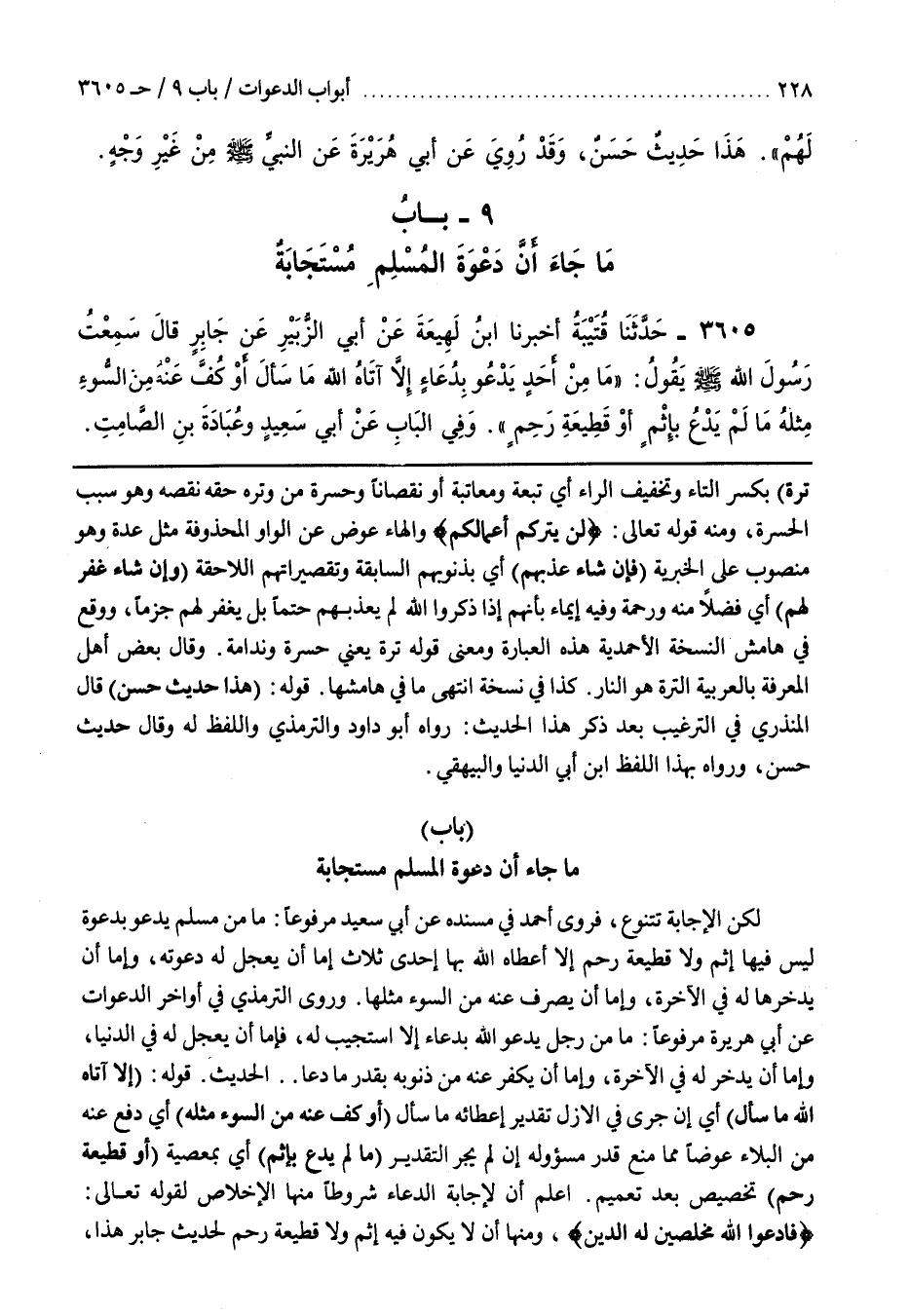 وَرَوَى التِّرْمِذِيُّ فِي أَوَاخِرِ الدَّعَوَاتِ عَنْ أَبِي هُرَيْرَةَ مَرْفُوعًا مَا مِنْ رَجُلٍ يَدْعُو اللَّهَ بِدُعَاءٍ إِلَّا اسْتُجِيبَ لَهُ فَإِمَّا أَنْ يُعَجِّلَ لَهُ فِي الدُّنْيَا وَإِمَّا أَنْ يَدَّخِرَ لَهُ فِي الْآخِرَةِ وَإِمَّا أَنْ يُكَفِّرَ عَنْهُ مِنْ ذُنُوبِهِ بِقَدْرِ مَا دَعَا