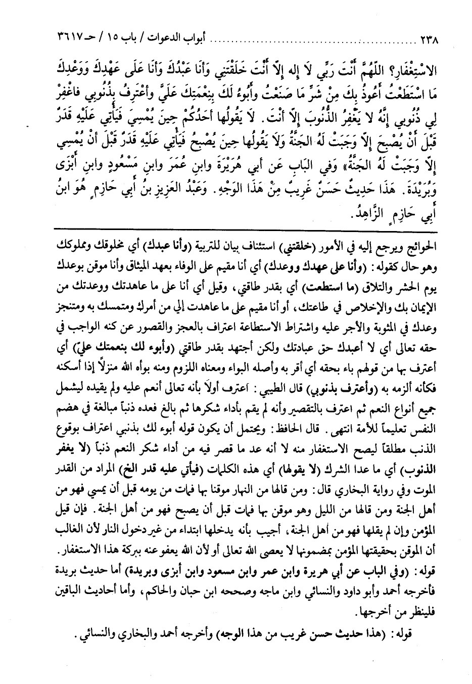 قَالَ الْحَافِظُ وَيُحْتَمَلُ أَنْ يَكُونَ قَوْلُهُ أَبُوءُ لَكَ بذنبي اعتراف بِوُقُوعِ الذَّنْبِ مُطْلَقًا لِيَصِحَّ الِاسْتِغْفَارُ مِنْهُ لَا أَنَّهُ عَدَّ مَا قَصَّرَ فِيهِ مِنْ أَدَاءِ شُكْرِ النِّعَمِ ذَنْبًا لَا يَغْفِرُ الذُّنُوبَ أَيْ مَا عَدَا الشِّرْكَ لَا يَقُولُهَا أَيْ هَذِهِ الْكَلِمَاتِ فَيَأْتِي عَلَيْهِ قَدَرٌ إِلَخْ الْمُرَادُ مِنَ الْقَدَرِ الْمَوْتُ وَفِي رِوَايَةِ الْبُخَارِيِّ قَالَ وَمَنْ قَالَهَا مِنَ النَّهَارِ مُوقِنًا بِهَا فَمَاتَ مِنْ يَوْمِهِ قَبْلَ أَنْ يُمْسِيَ فَهُوَ مِنْ أَهْلِ الْجَنَّةِ وَمَنْ قَالَهَا مِنَ اللَّيْلِ وَهُوَ مُوقِنٌ بِهَا فَمَاتَ قَبْلَ أَنْ يُصْبِحَ فَهُوَ مِنْ أَهْلِ الْجَنَّةِ